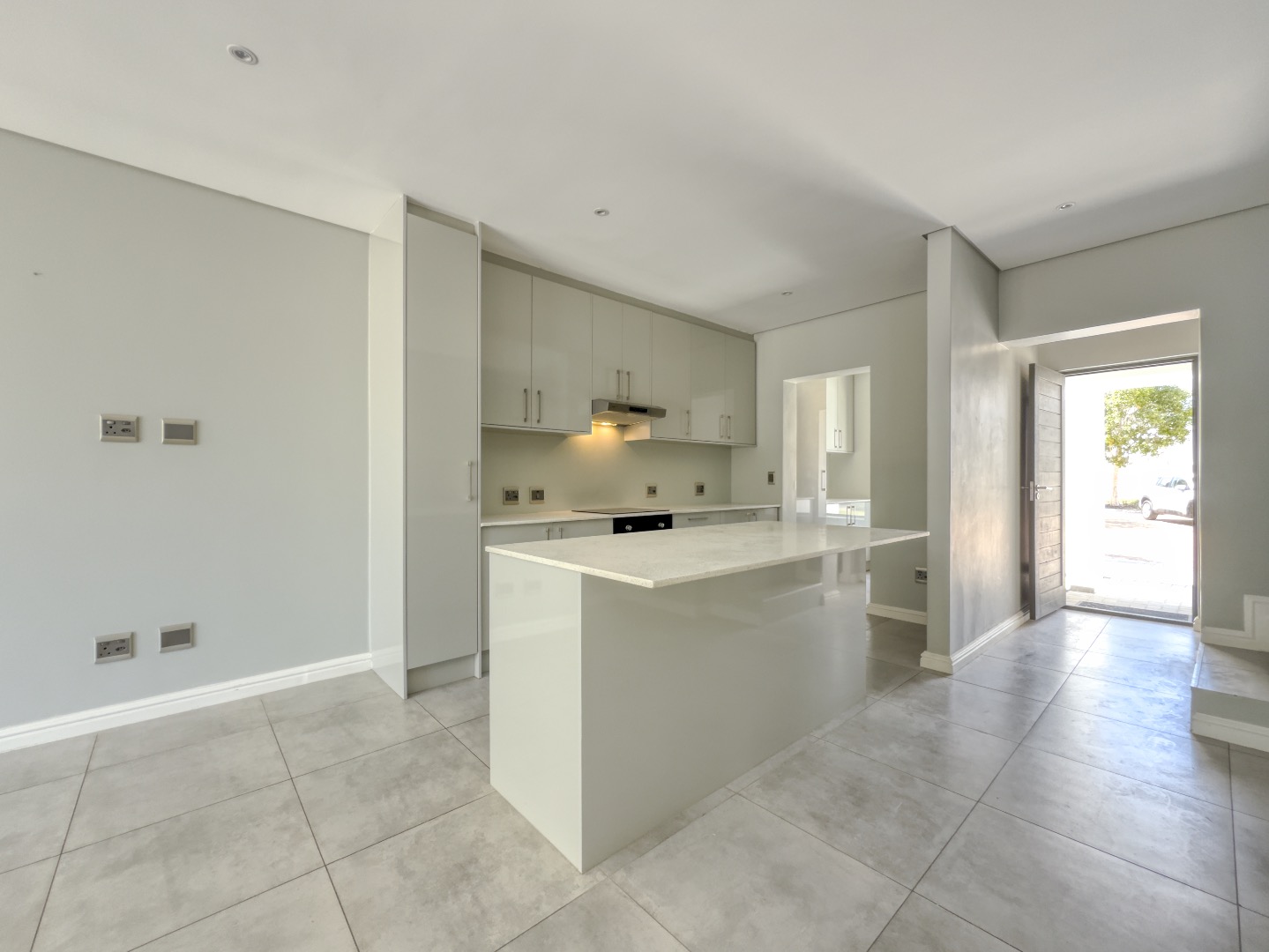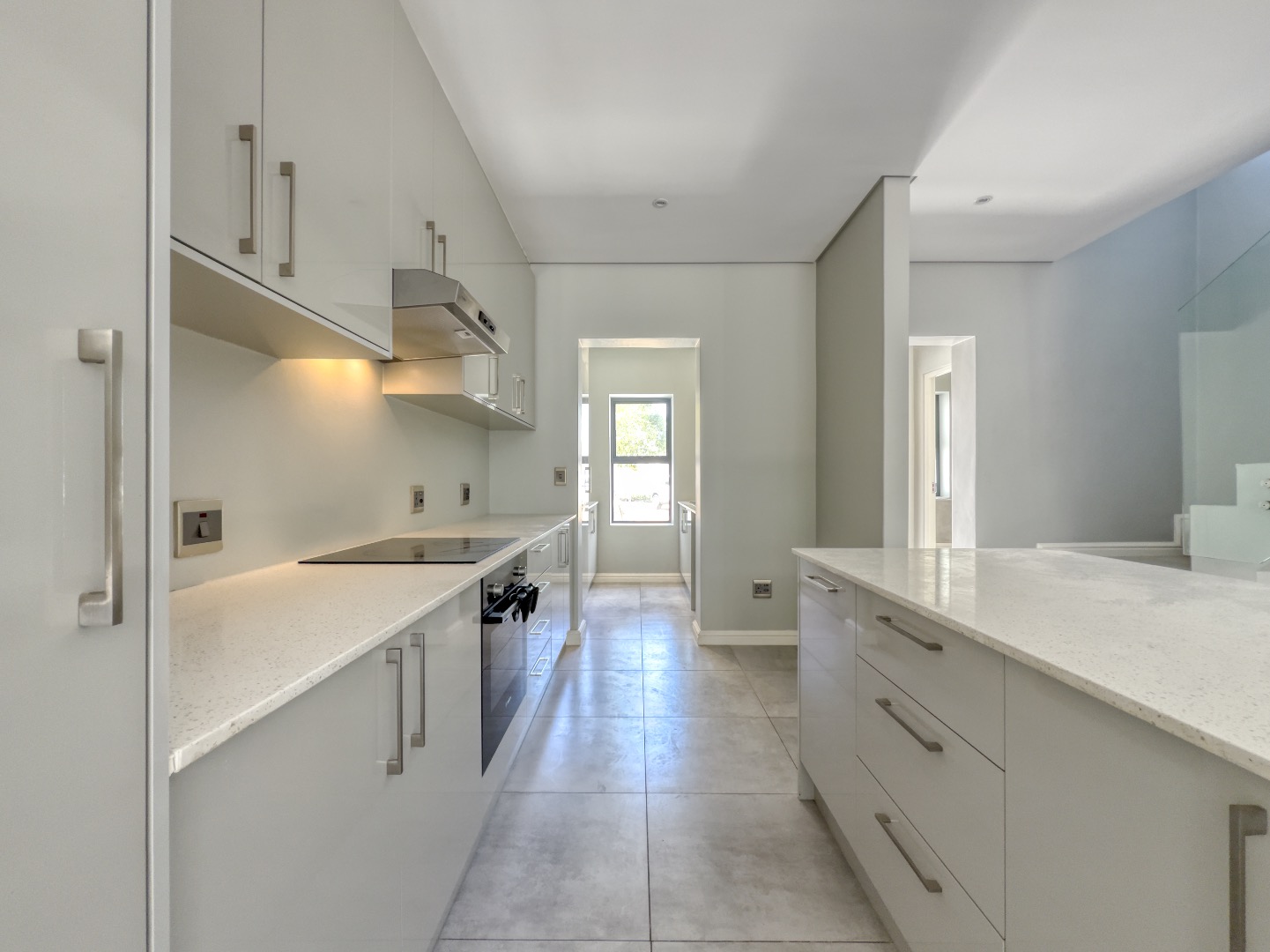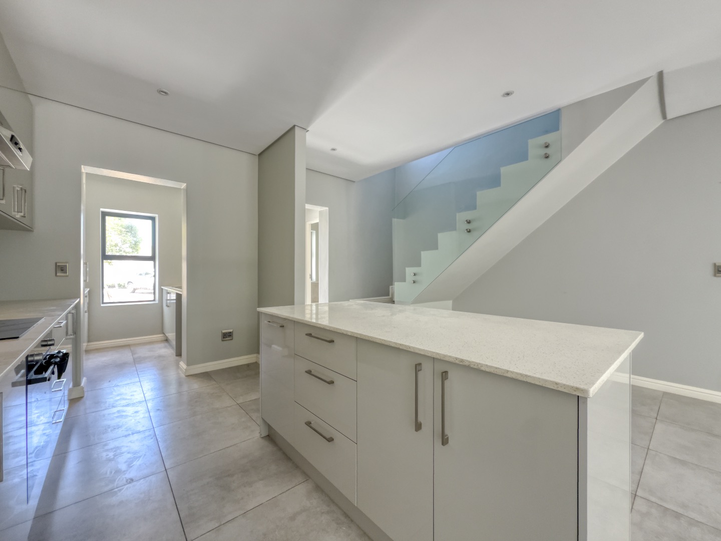 The kitchen is thoughtfully designed with sleek light-grey cabinetry, pristine white quartz countertops, and a functional island that doubles as a casual dining space. Integrated appliances—including a hob, oven, and extractor fan—complete the clean, contemporary aesthetic.