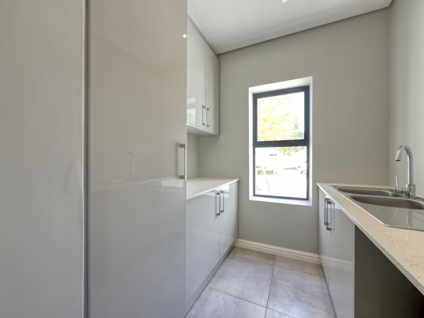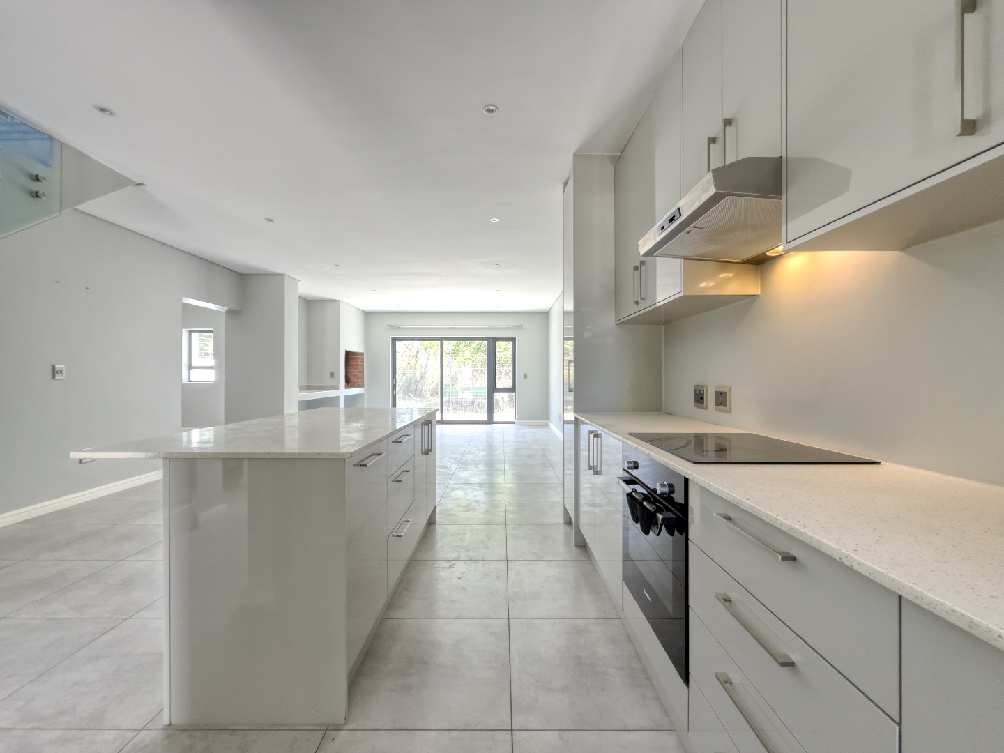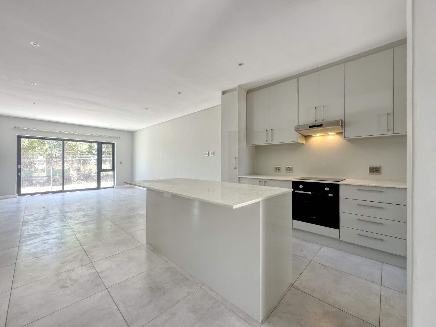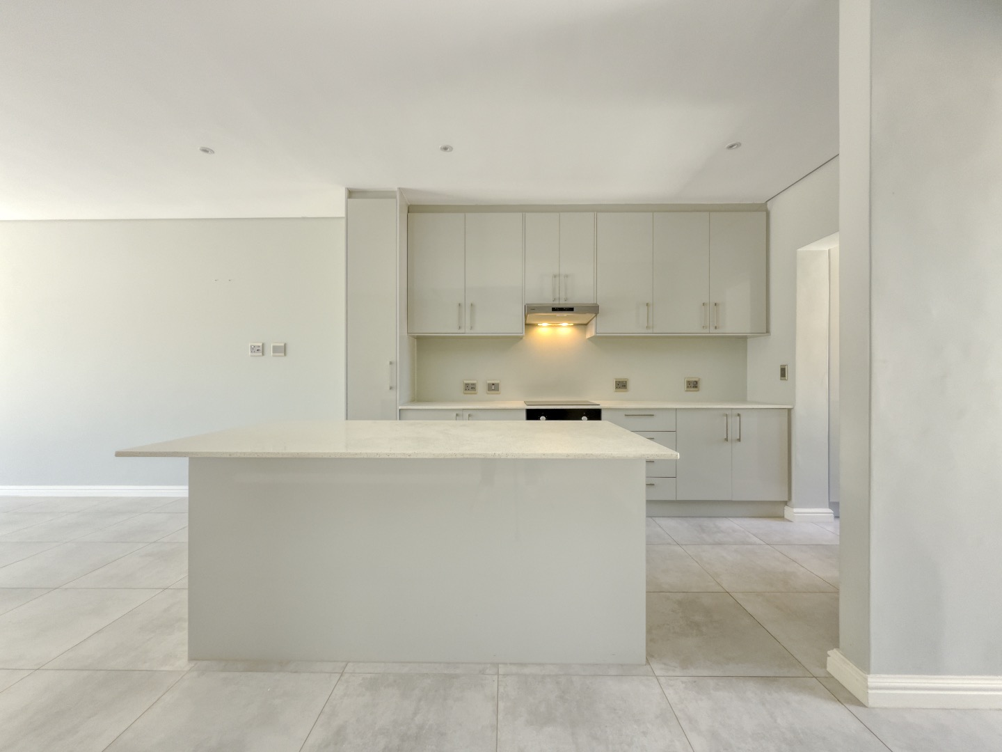 The kitchen is thoughtfully designed with sleek light-grey cabinetry, pristine white quartz countertops, and a functional island that doubles as a casual dining space. Integrated appliances—including a hob, oven, and extractor fan—complete the clean, contemporary aesthetic.