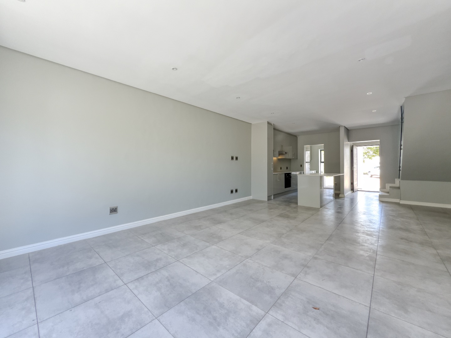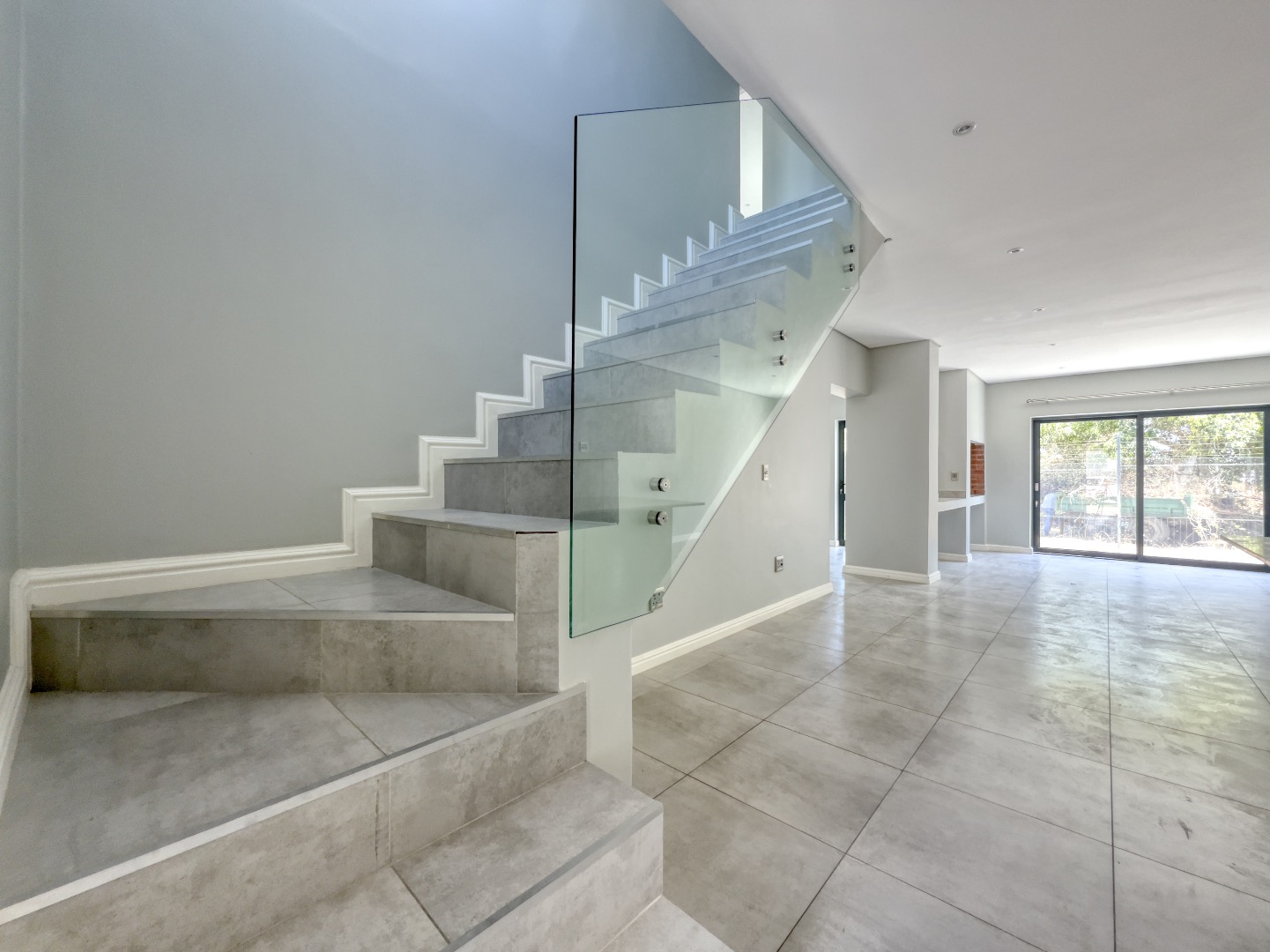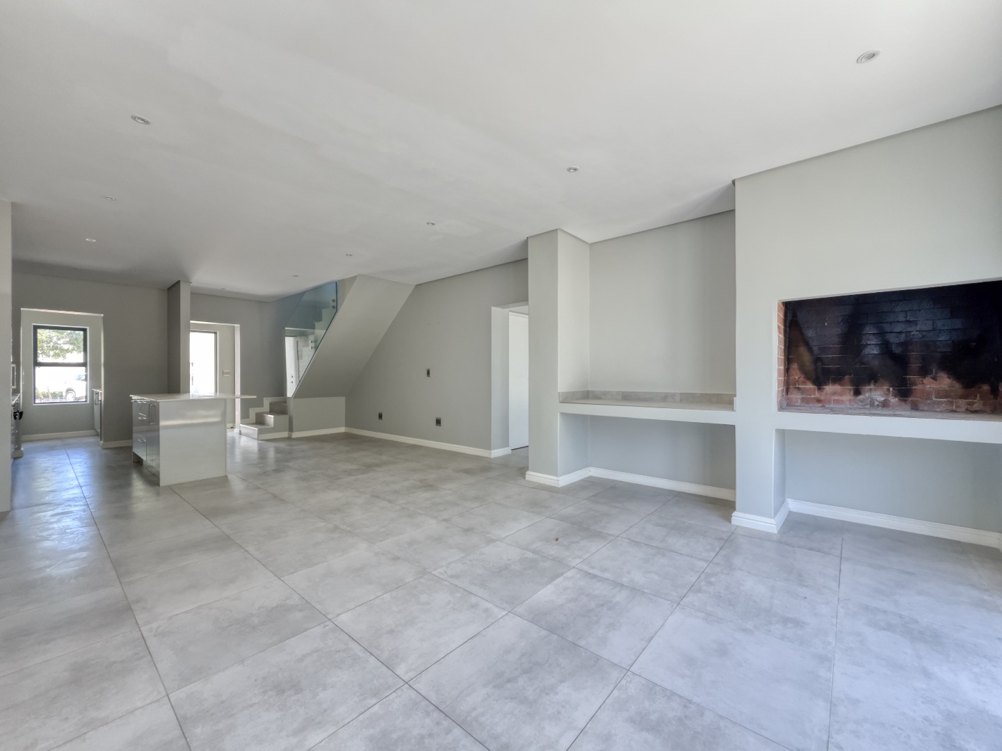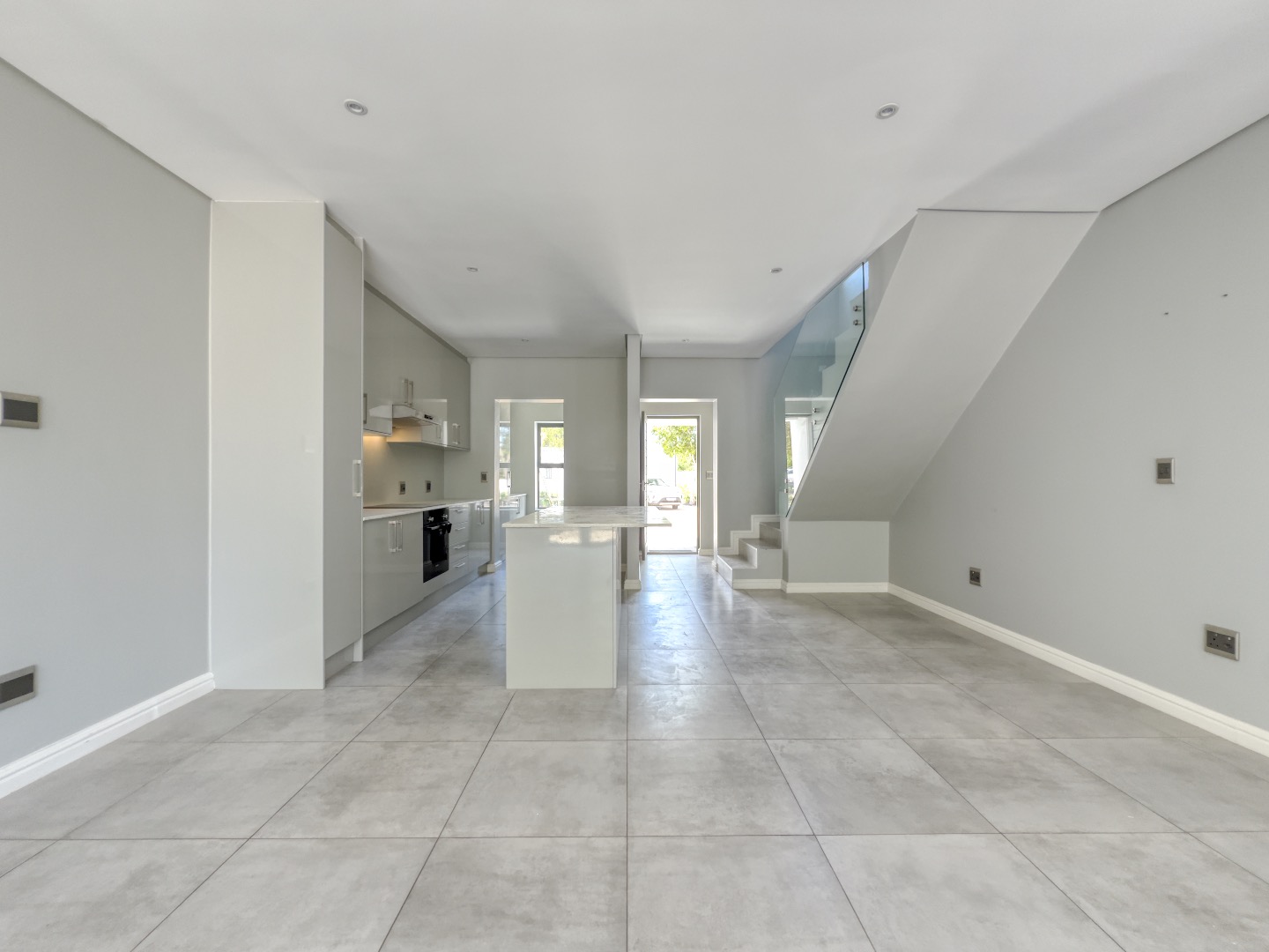 The home welcomes you into a bright, open-plan living area where the lounge and kitchen flow seamlessly, creating an inviting space ideal for both everyday living and entertaining. Tiled flooring throughout and recessed lighting enhance the airy atmosphere, while a striking glass-railed staircase adds a touch of modern sophistication.