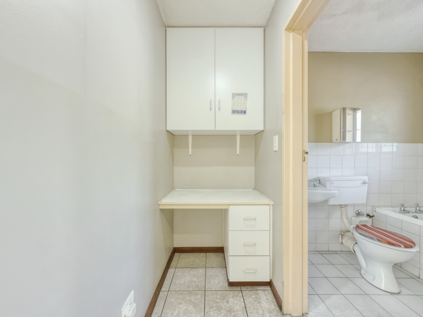The studio area comfortably fits a double bed with lots of storage space. Just before the living space is a built-in study nook, making the unit ideal for students or anyone working from home. The full bathroom features a bath, toilet, and a vanity with a mirrored cabinet.