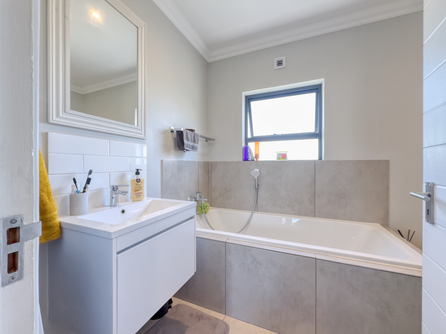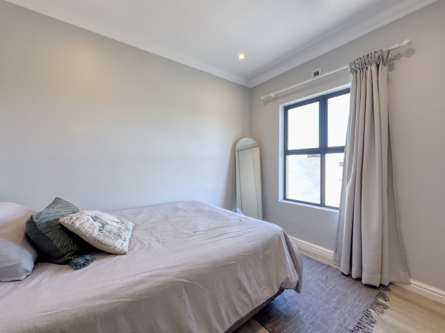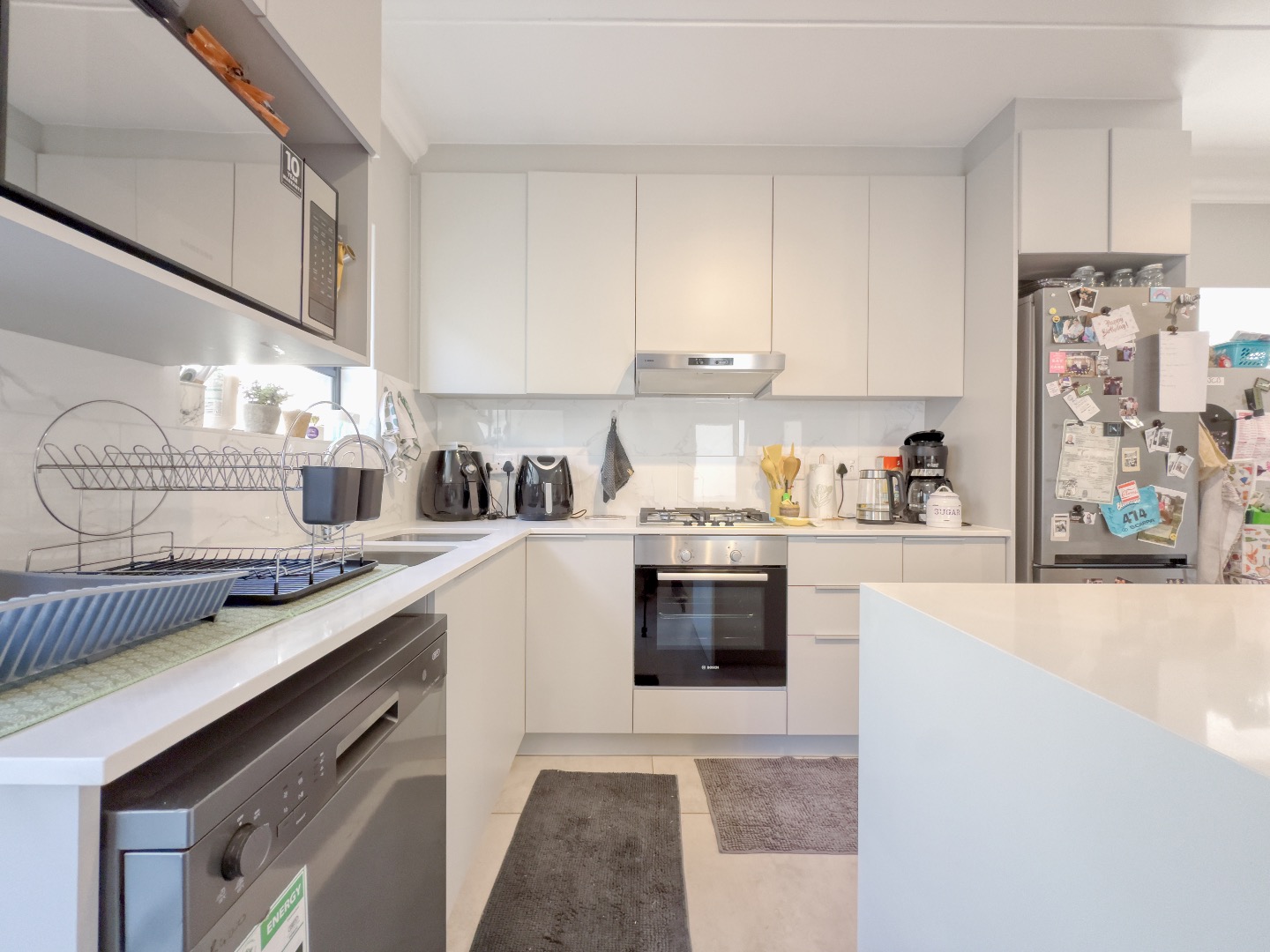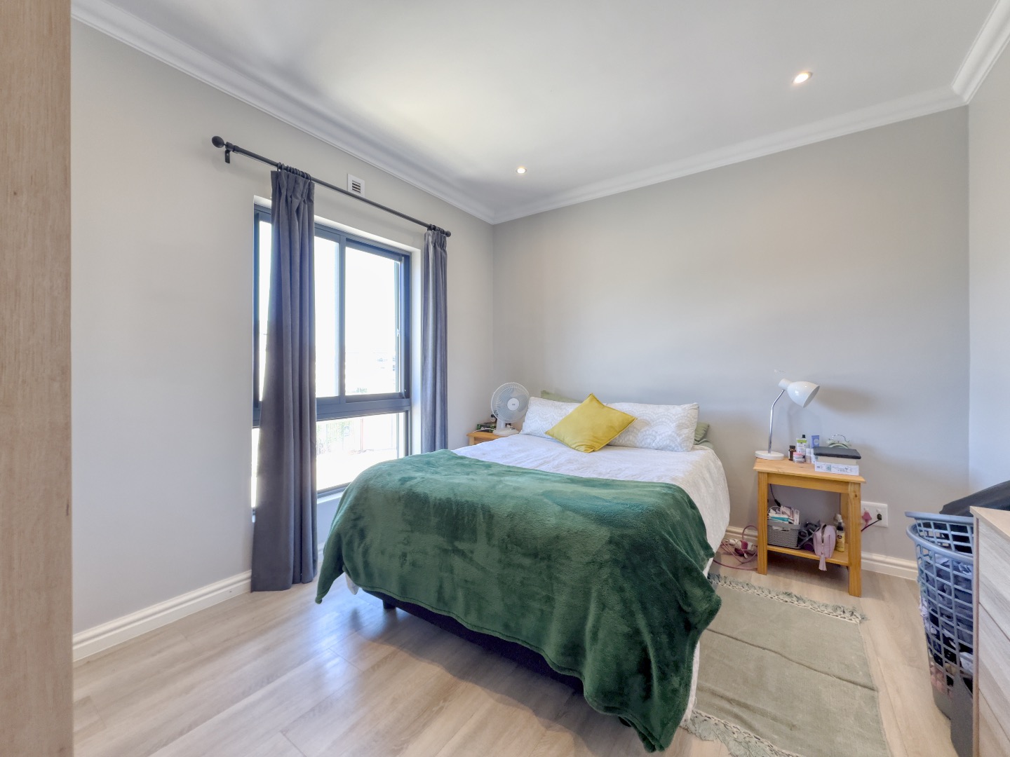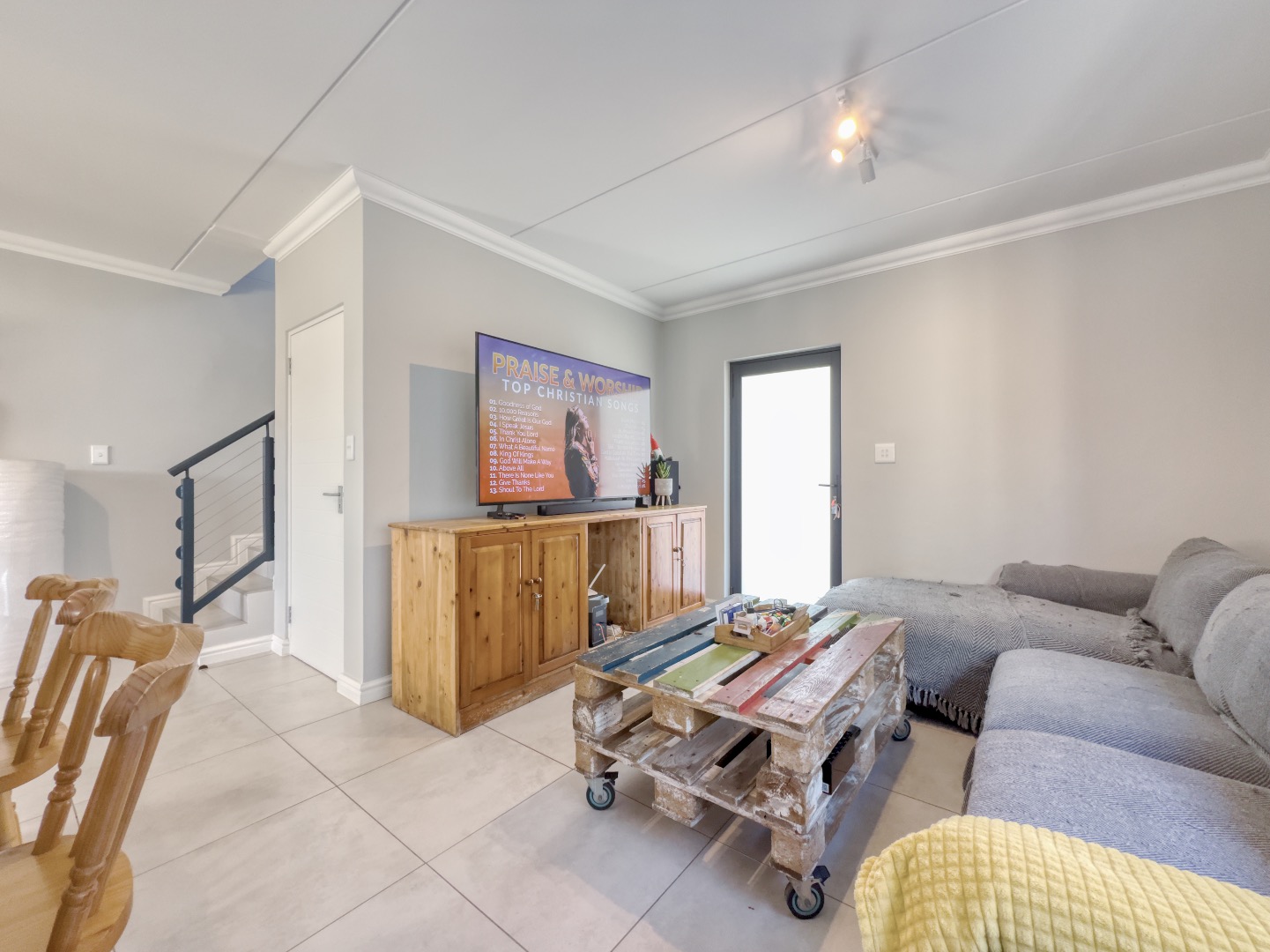 Offering ±140 sqm under roof on a 291 sqm erf, this contemporary home features an open-plan kitchen with light cabinetry, white countertops, and integrated appliances, flowing into the dining area, lounge, and family TV room. Large windows and sliding doors create bright, airy living spaces.