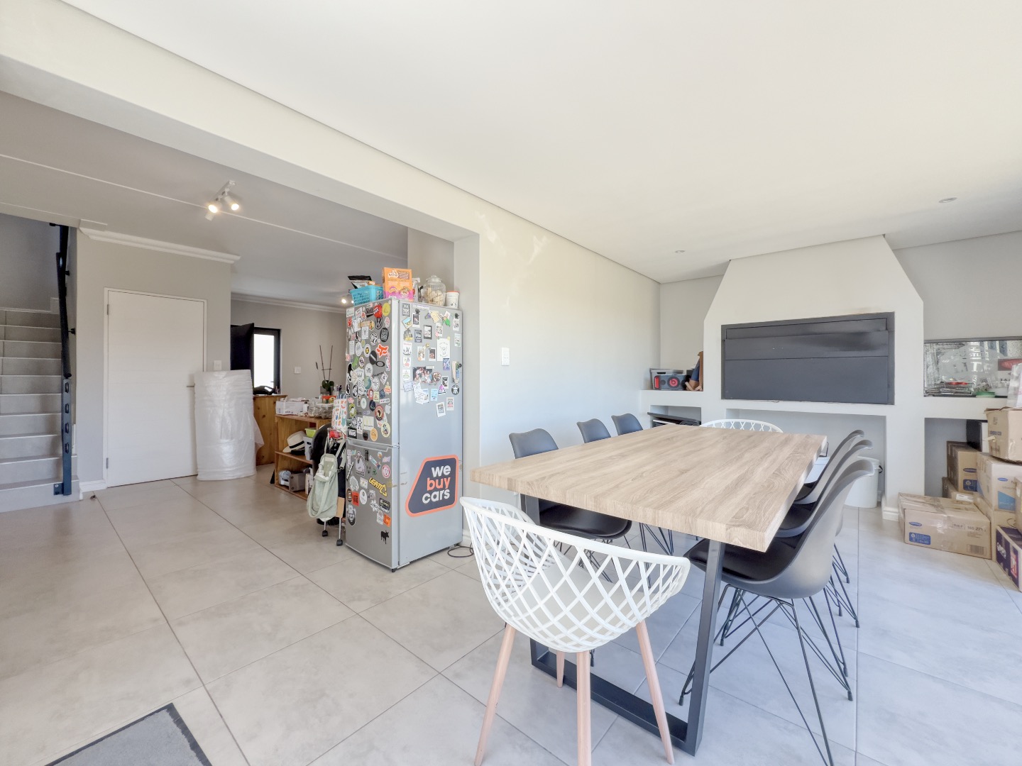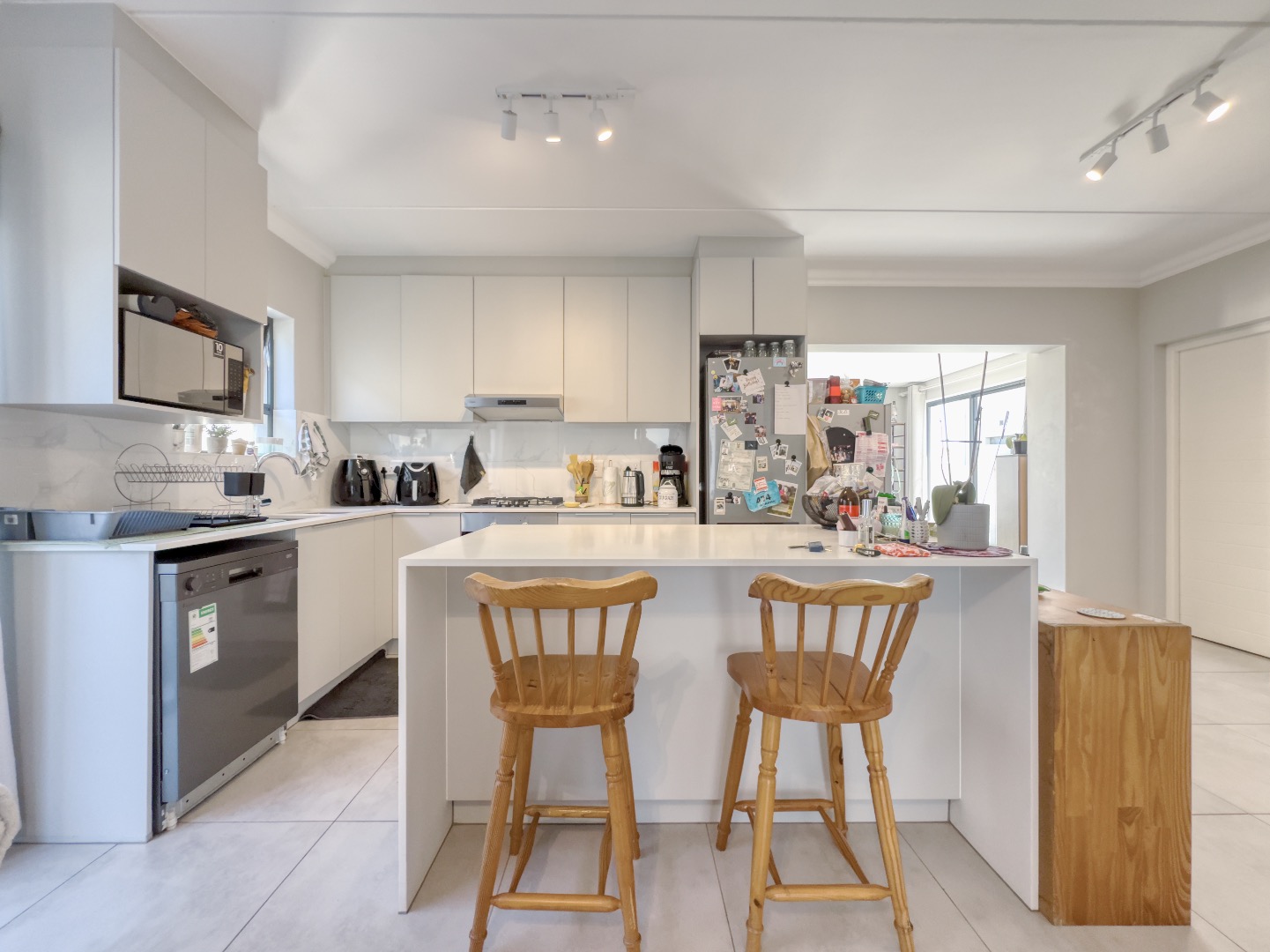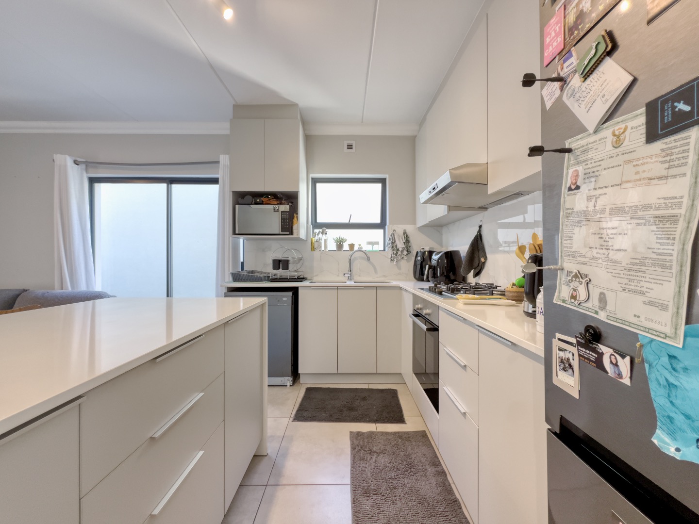 Offering ±140 sqm under roof on a 291 sqm erf, this contemporary home features an open-plan kitchen with light cabinetry, white countertops, and integrated appliances, flowing into the dining area, lounge, and family TV room. Large windows and sliding doors create bright, airy living spaces.