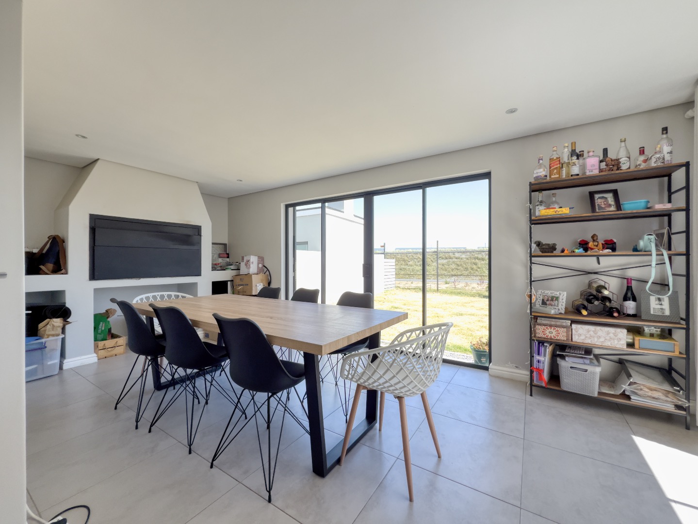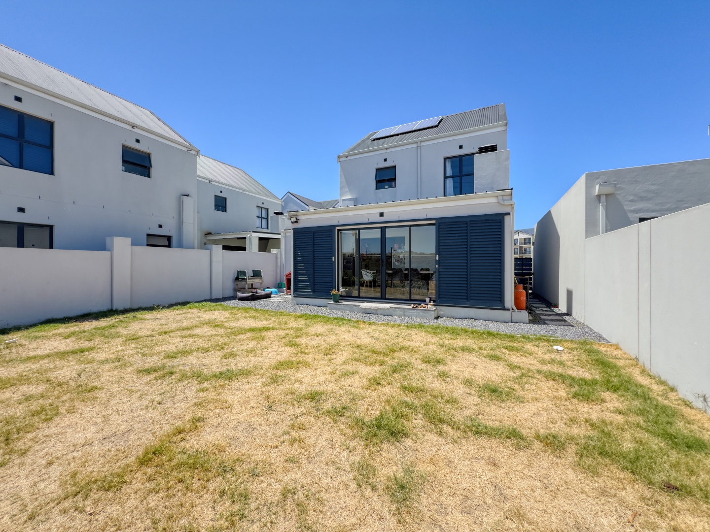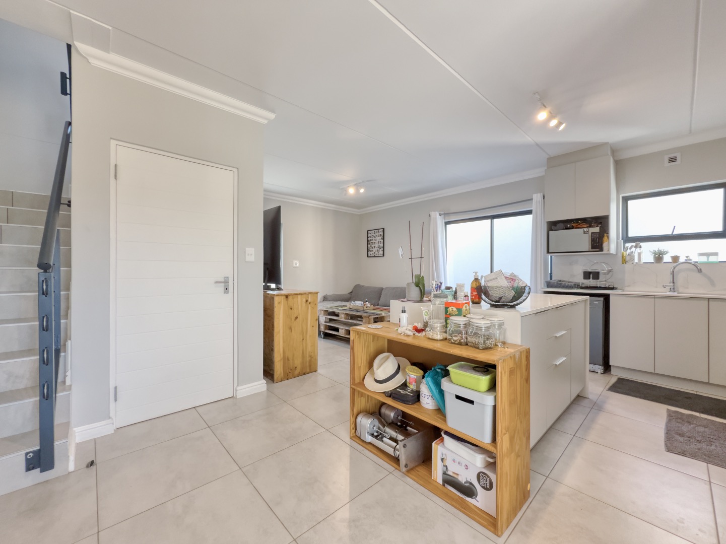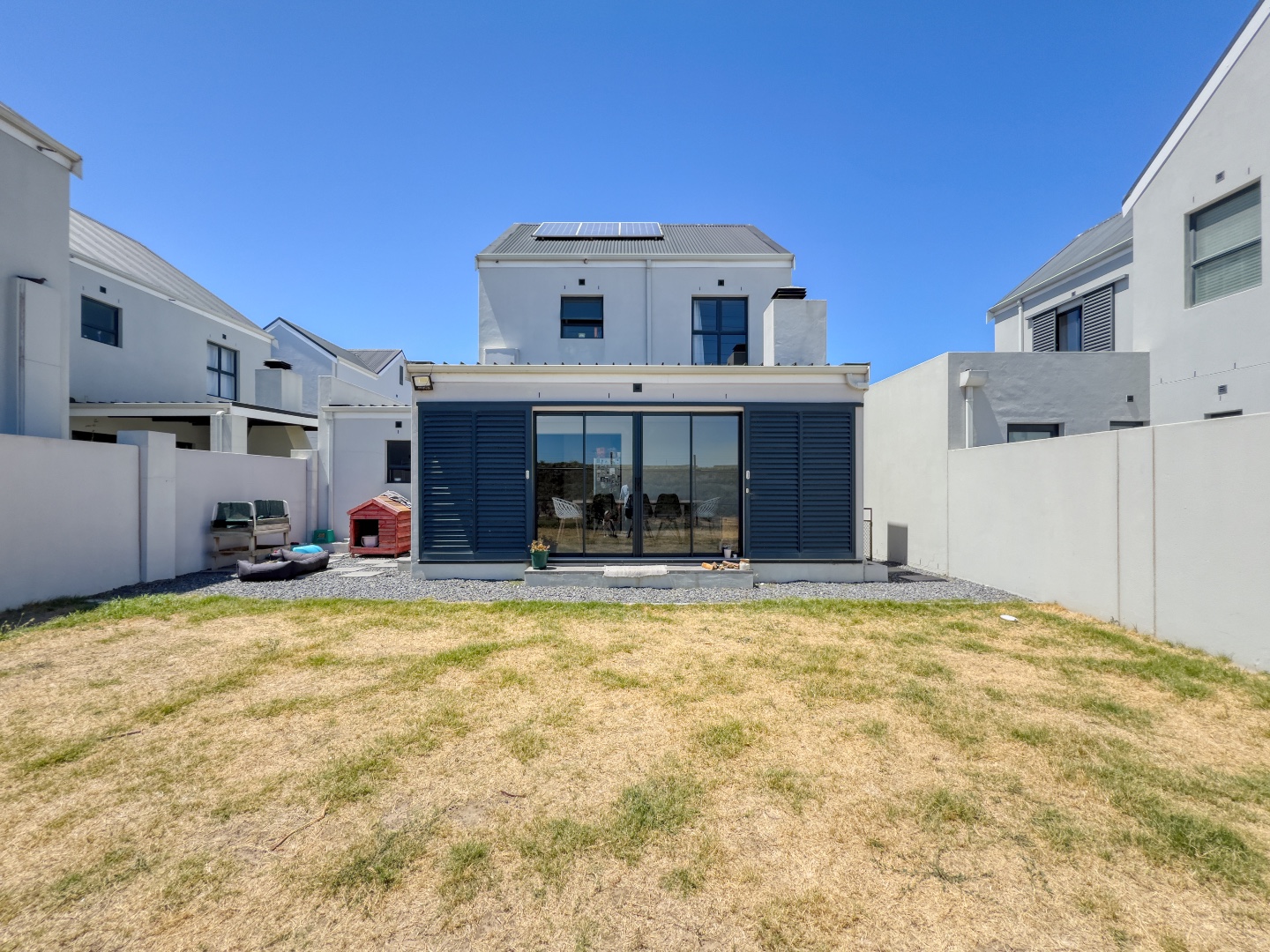 Offering ±140 sqm under roof on a 291 sqm erf, this contemporary home features an open-plan kitchen with light cabinetry, white countertops, and integrated appliances, flowing into the dining area, lounge, and family TV room. Large windows and sliding doors create bright, airy living spaces.