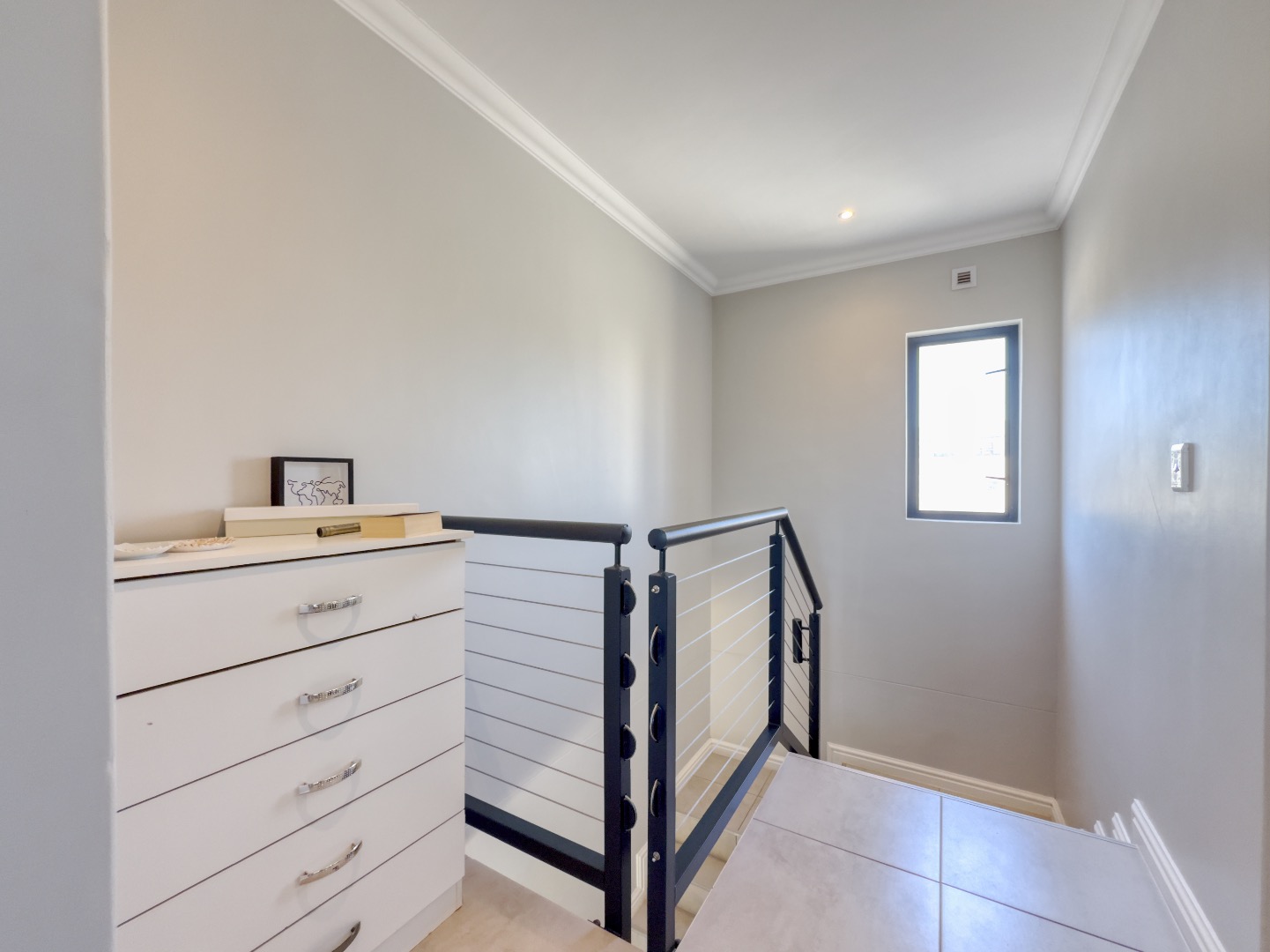 The living area opens to an outdoor entertainment space with built-in braai. A modern staircase with cable railing leads upstairs, adding to the home’s clean, contemporary design.