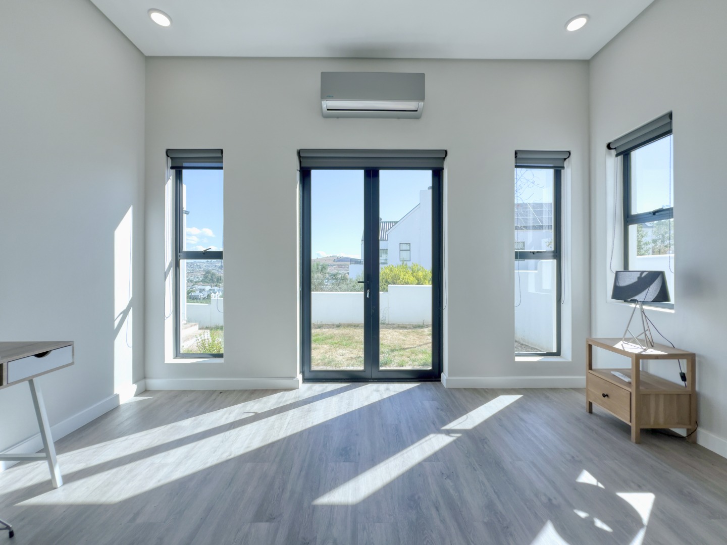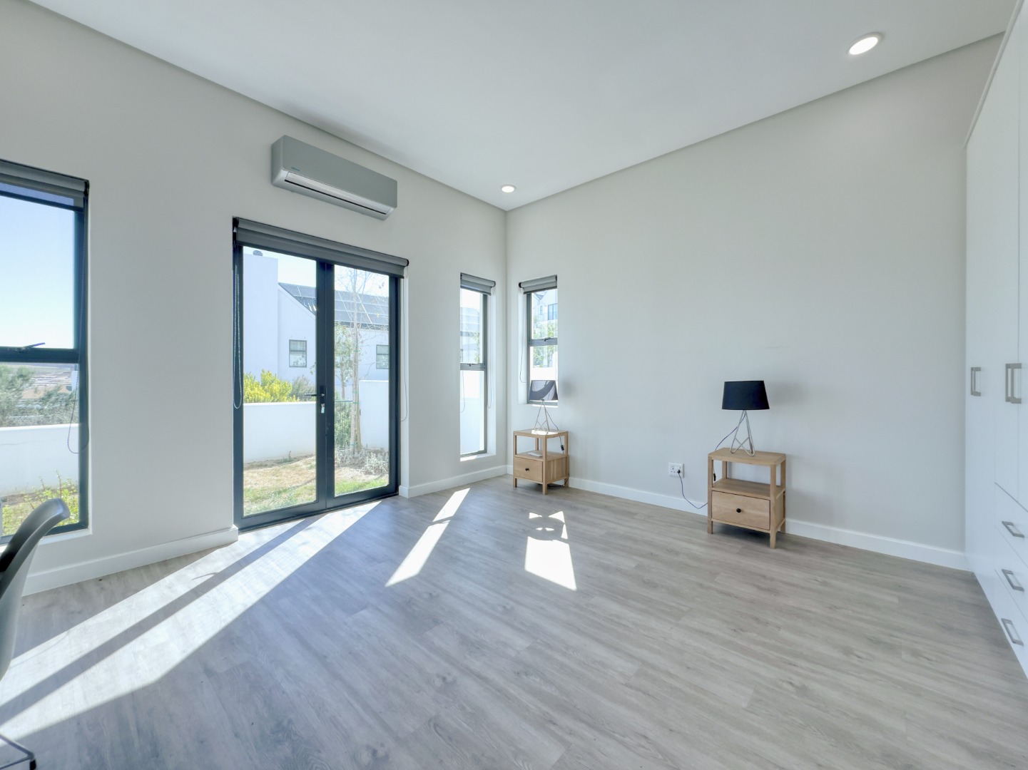 All three bedrooms are fitted with air conditioning. The main bedroom is generously sized, includes an en-suite bathroom, and opens directly onto the garden—offering a private and peaceful retreat. The remaining two bedrooms are well-proportioned and share a modern full bathroom.