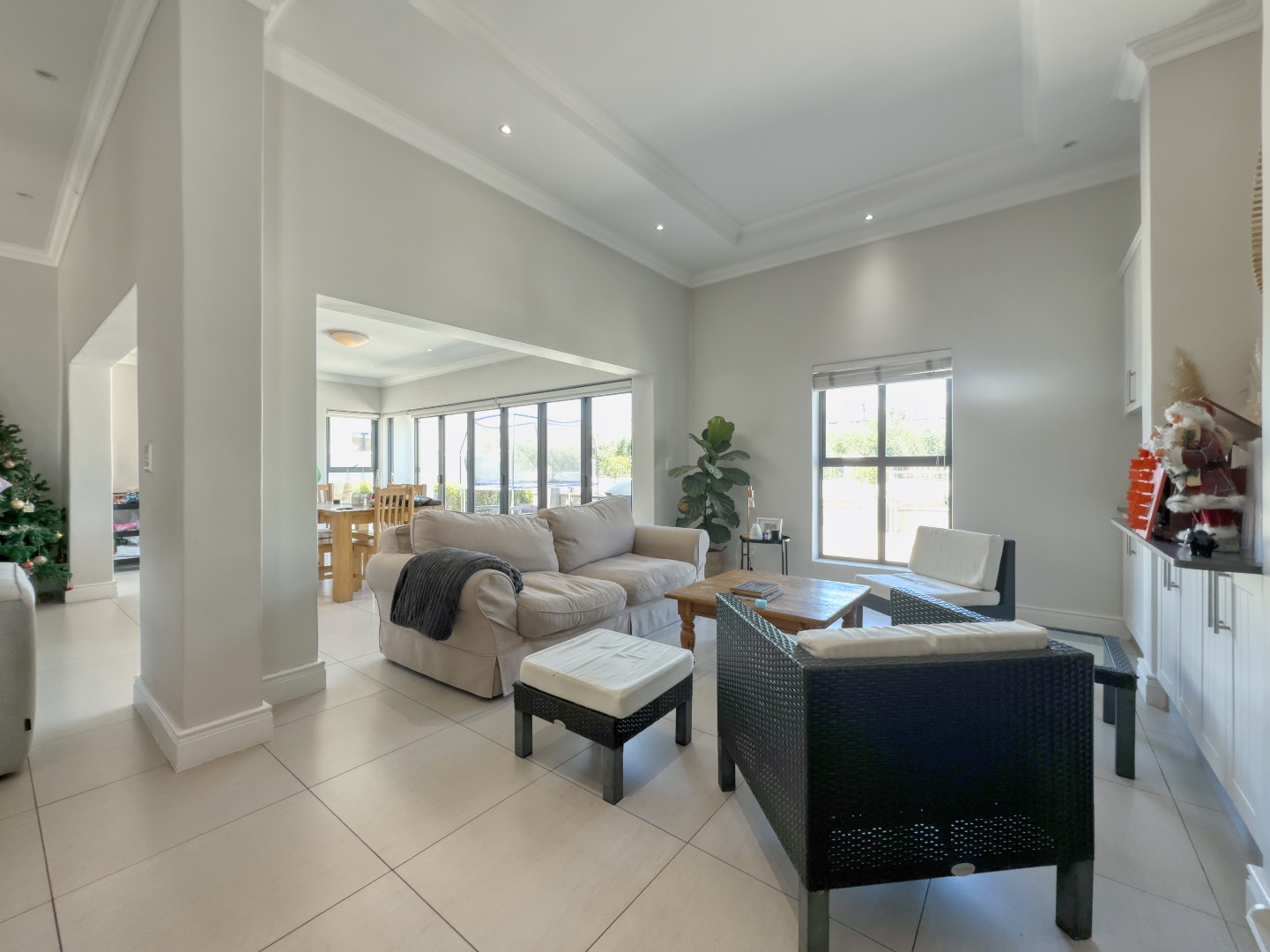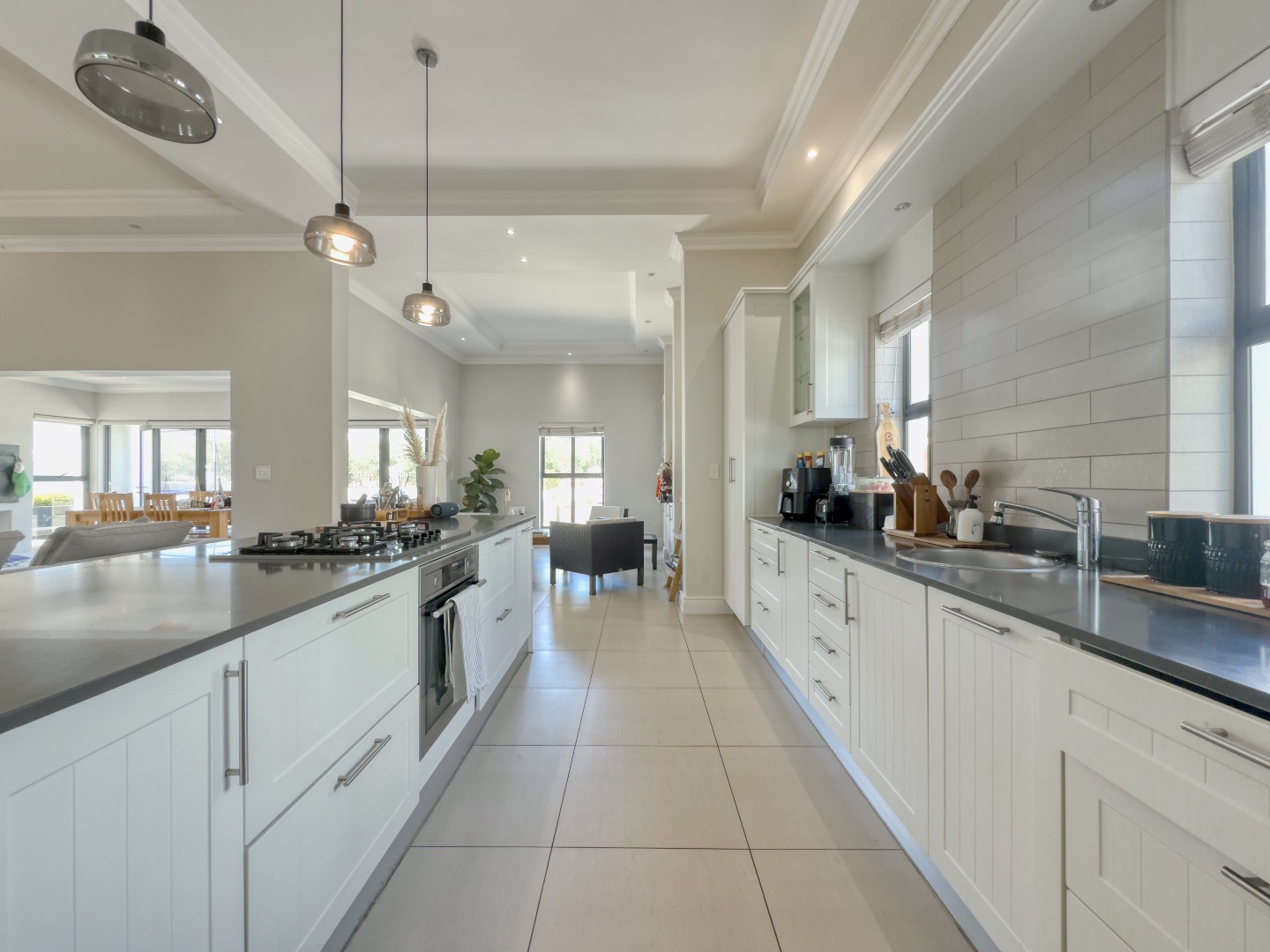 Step inside to an expansive open-plan layout, seamlessly connecting the living, dining, and kitchen areas. The heart of the home is a modern kitchen, equipped with a large island, gas hob, built-in oven, and sleek white cabinetry complemented by dark countertops. High ceilings with elegant crown molding, recessed lighting, and durable tiled flooring enhance the bright and airy ambiance throughout. The home further offers two comfortable lounges, a dedicated dining area, a family TV room, a guest toilet, and a practical laundry room.