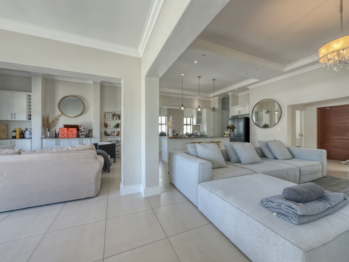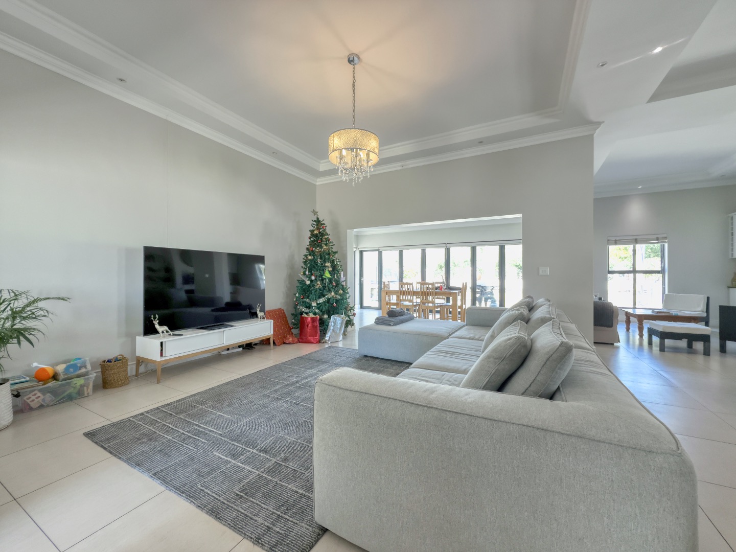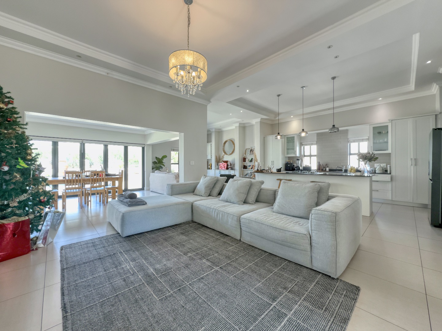 Step inside to an expansive open-plan layout, seamlessly connecting the living, dining, and kitchen areas. The heart of the home is a modern kitchen, equipped with a large island, gas hob, built-in oven, and sleek white cabinetry complemented by dark countertops. High ceilings with elegant crown molding, recessed lighting, and durable tiled flooring enhance the bright and airy ambiance throughout. The home further offers two comfortable lounges, a dedicated dining area, a family TV room, a guest toilet, and a practical laundry room.