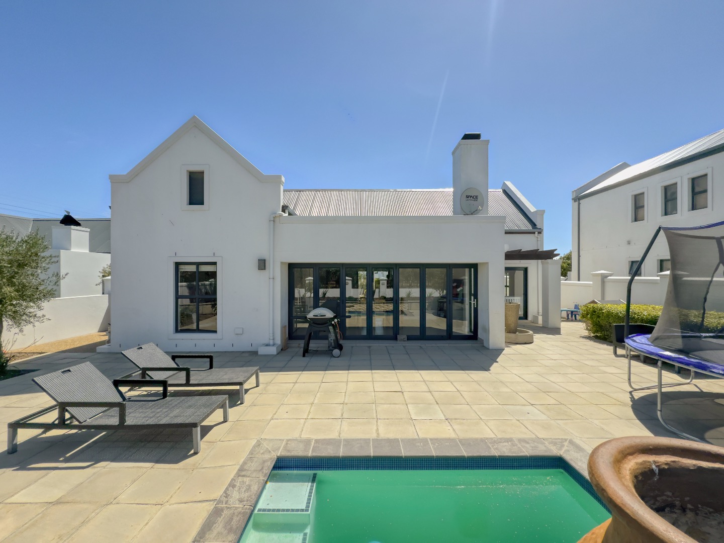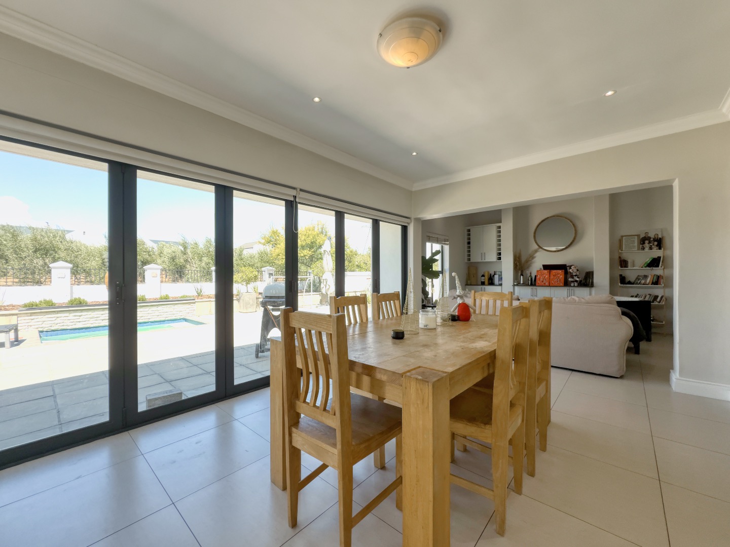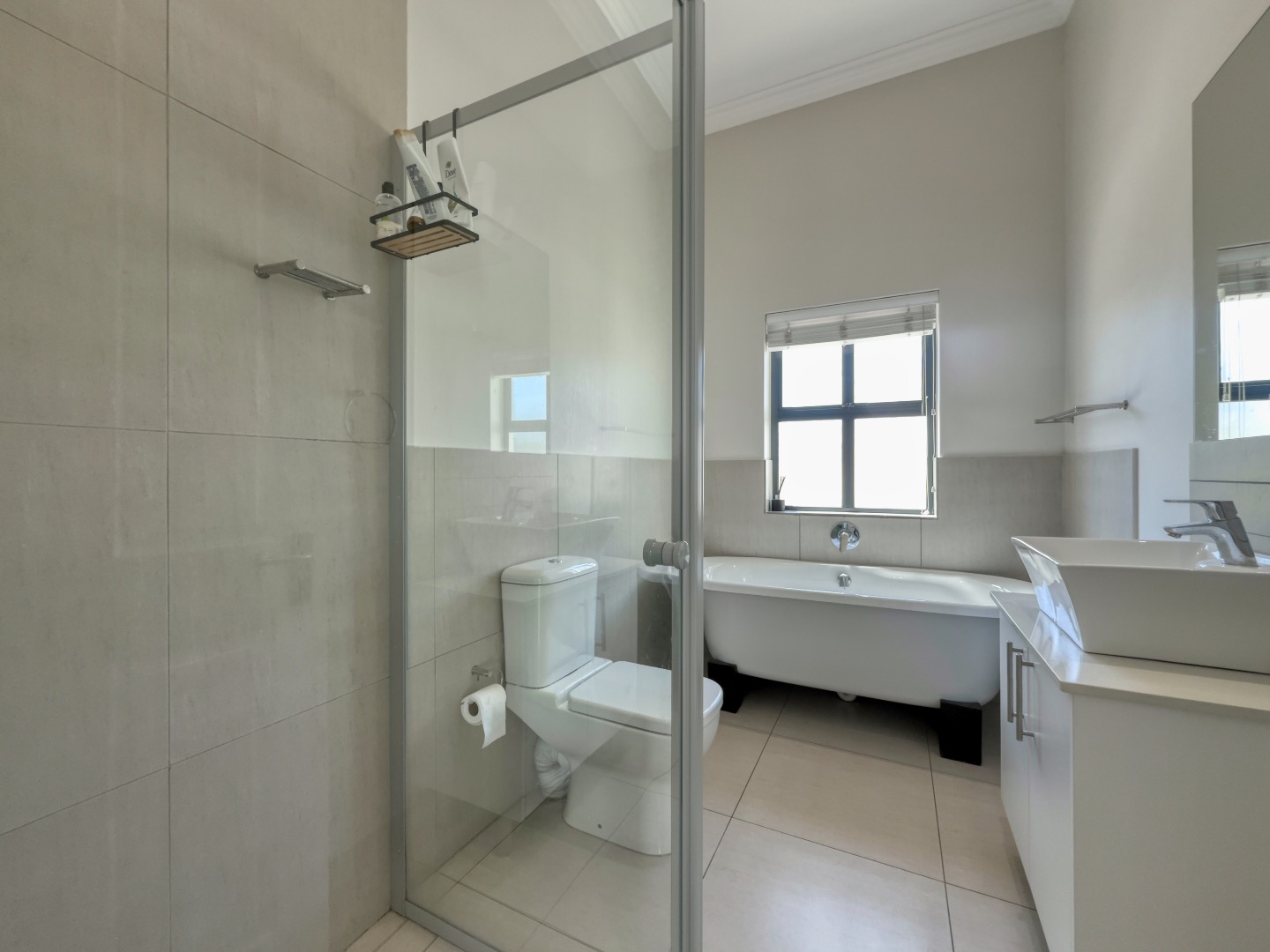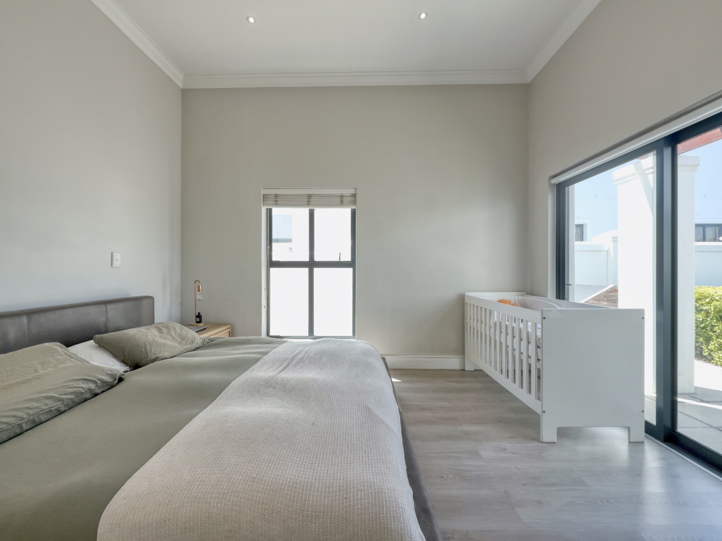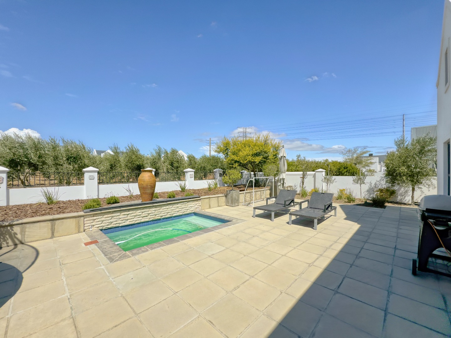 Discover modern living in this exquisite 3-bedroom, 3-bathroom residence nestled within the prestigious Croydon Olive Estate in Somerset West. This property boasts a contemporary architectural style with clean white walls and distinctive gabled roofs, presenting excellent kerb appeal. The well-maintained exterior features neat landscaping and a paved driveway leading to a double garage, ensuring ample parking and convenience.