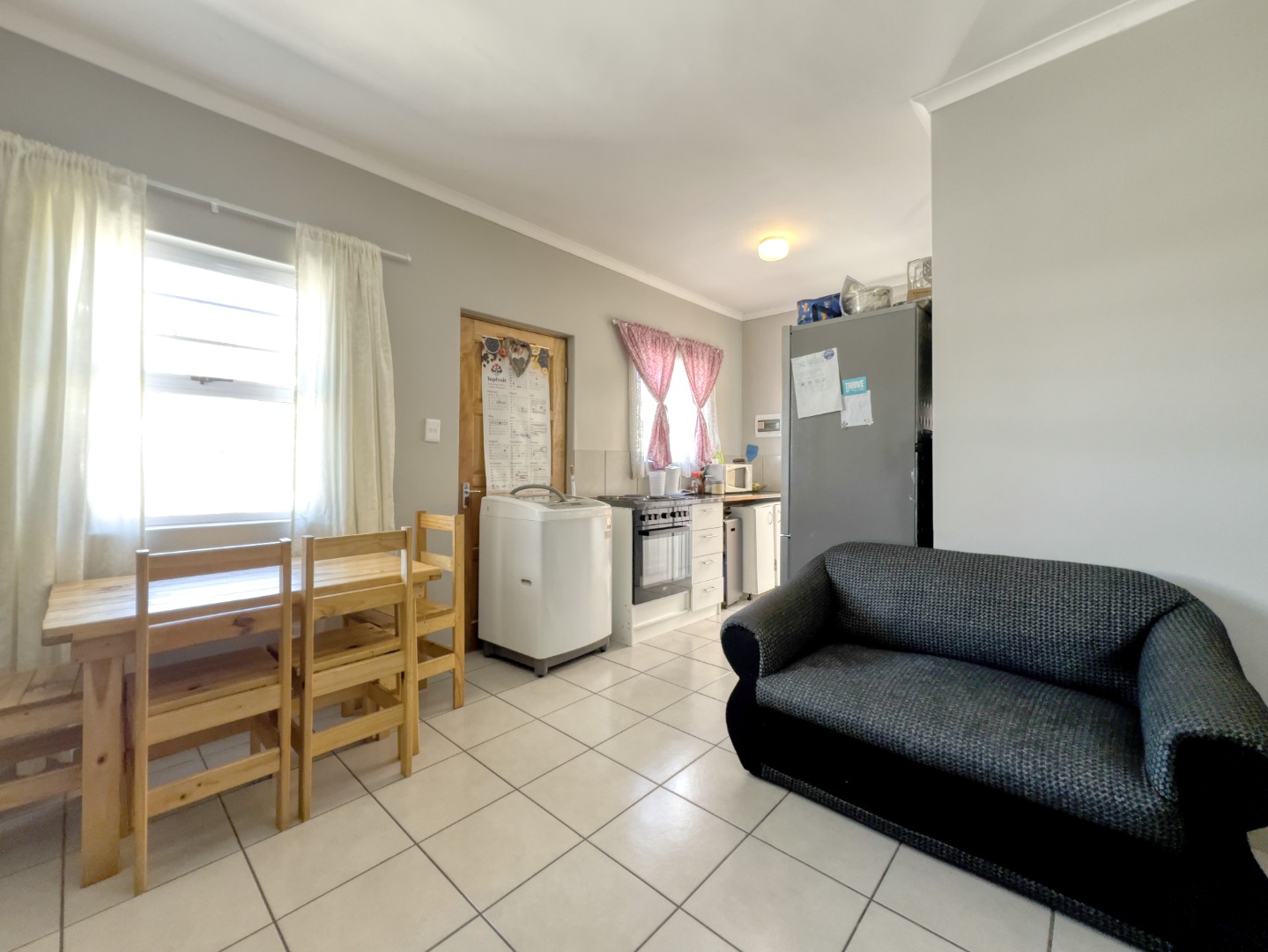 Step inside to an inviting open-plan living space, seamlessly connecting the lounge and kitchen areas. The functional galley-style kitchen is equipped with modern white cabinetry, sleek dark countertops, and an integrated stove/oven, offering ample storage and preparation space. Tiled flooring extends throughout these communal areas, providing a durable and easy-to-maintain finish, complemented by neutral wall colours and good natural light.