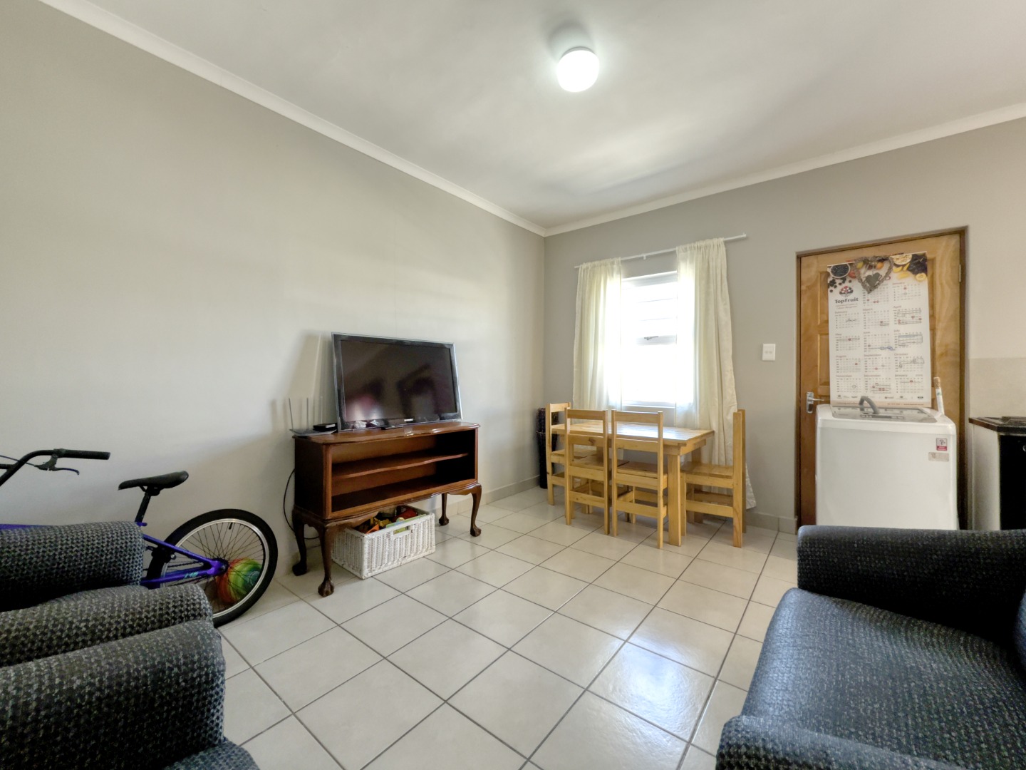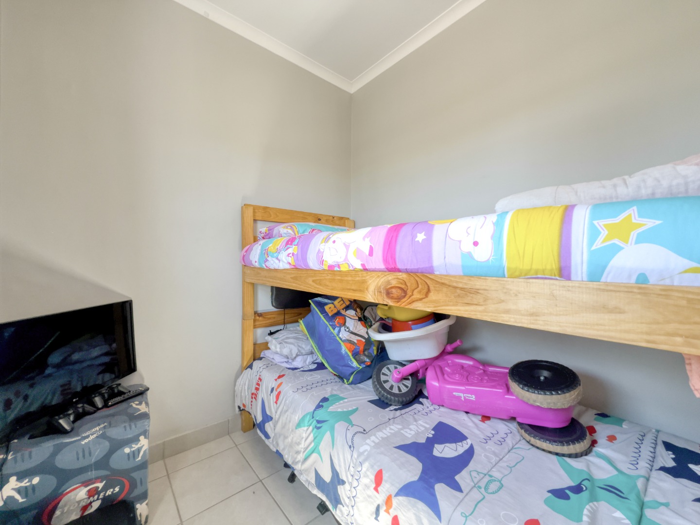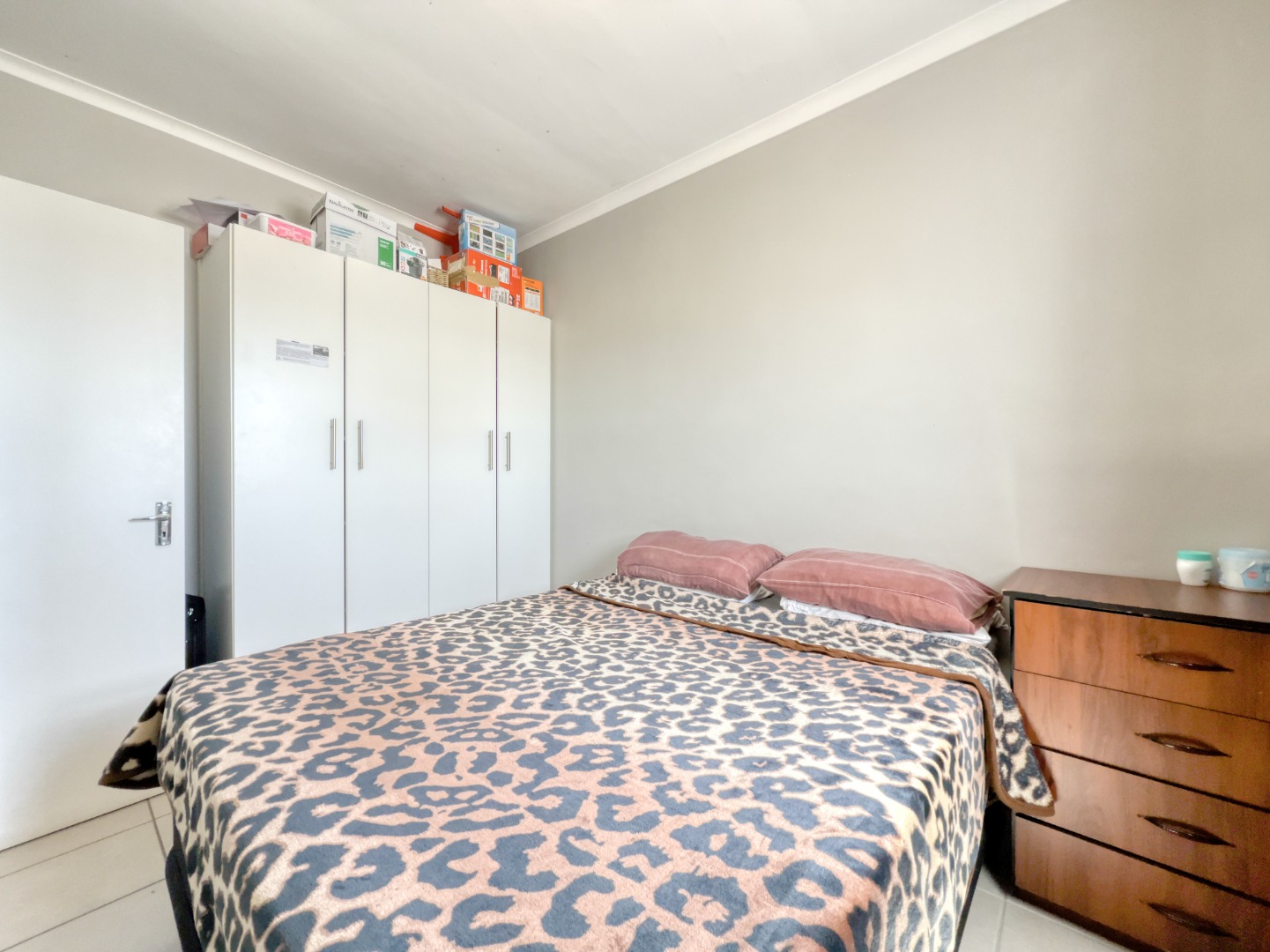This home features three comfortable bedrooms, each designed with neutral walls and tiled flooring, offering a versatile canvas for personal touches. Natural light streams through the windows, creating bright and airy retreats. The main bedroom includes a practical built-in wardrobe, enhancing storage solutions. A well-appointed bathroom serves the household, completing the functional layout.