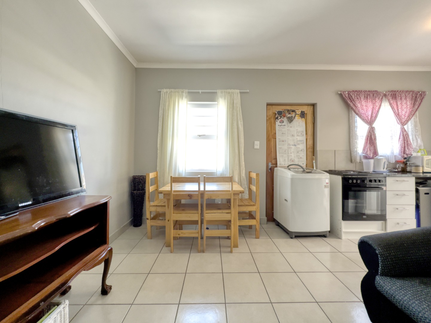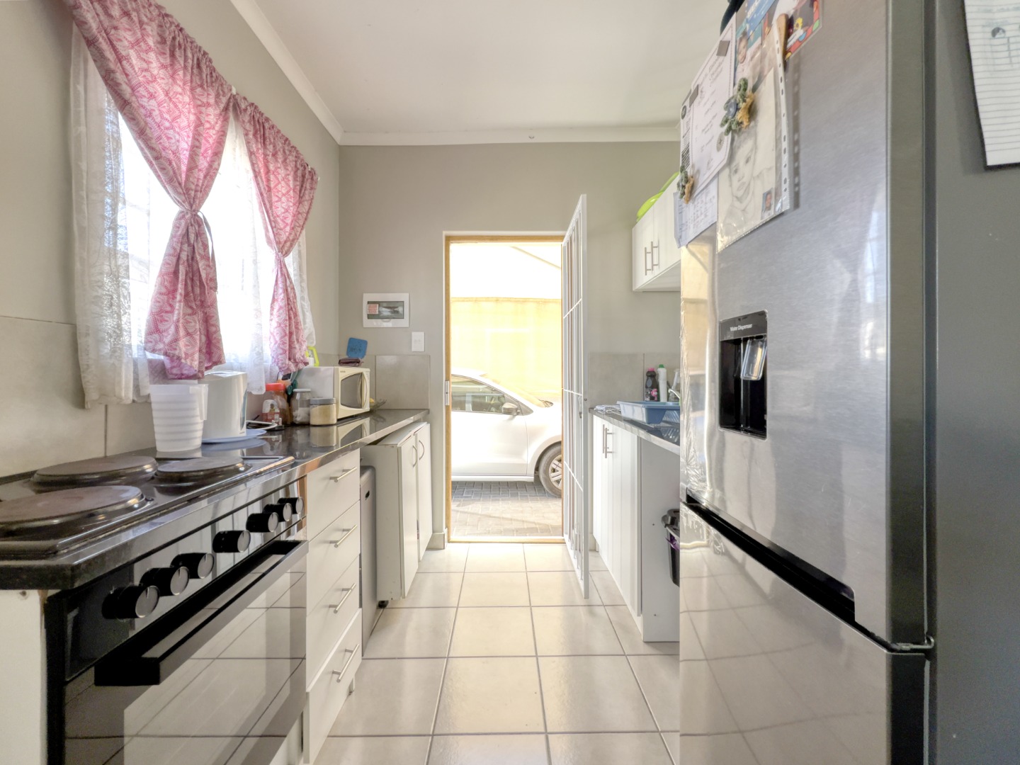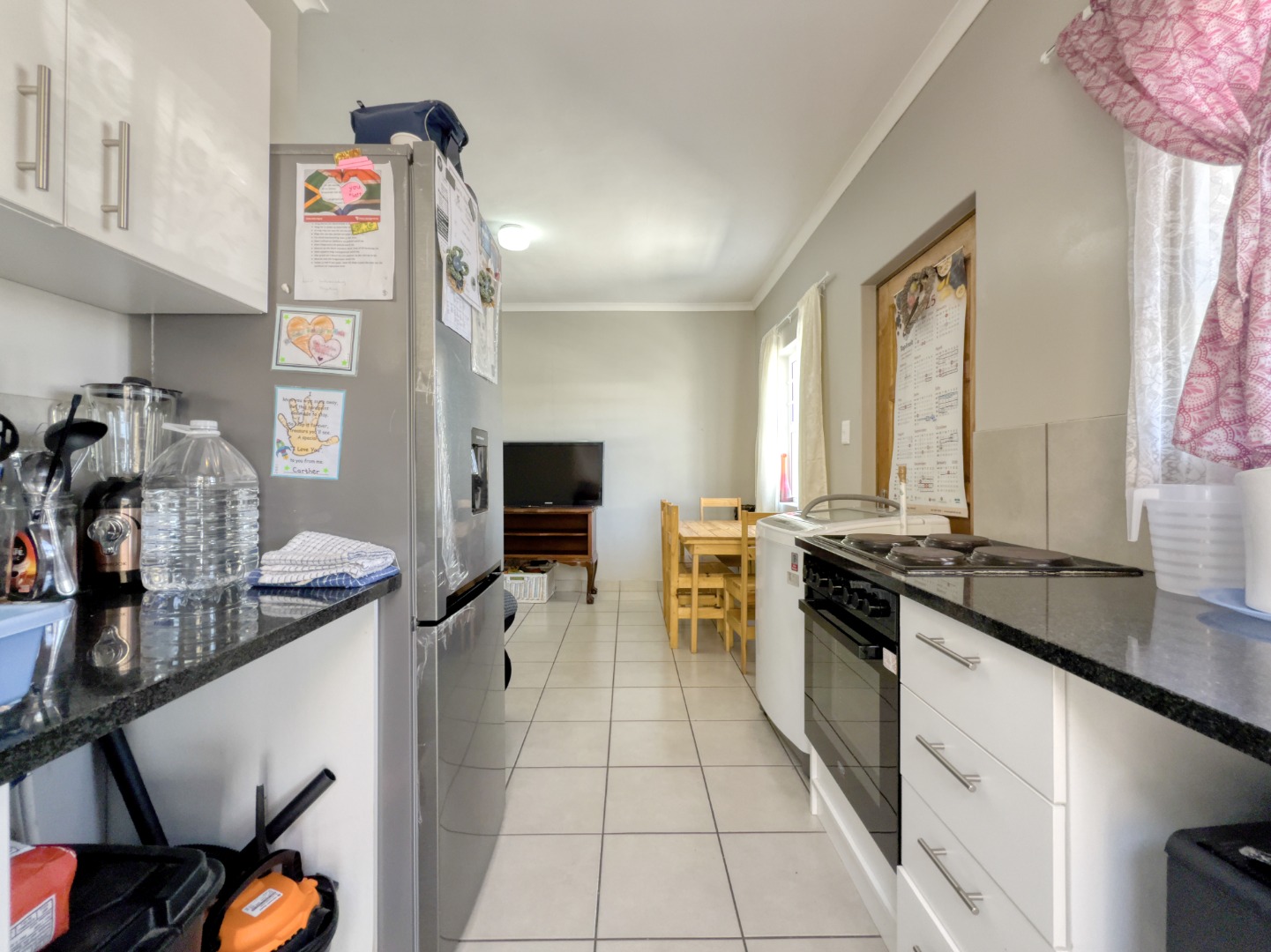 Step inside to an inviting open-plan living space, seamlessly connecting the lounge and kitchen areas. The functional galley-style kitchen is equipped with modern white cabinetry, sleek dark countertops, and an integrated stove/oven, offering ample storage and preparation space. Tiled flooring extends throughout these communal areas, providing a durable and easy-to-maintain finish, complemented by neutral wall colours and good natural light.
