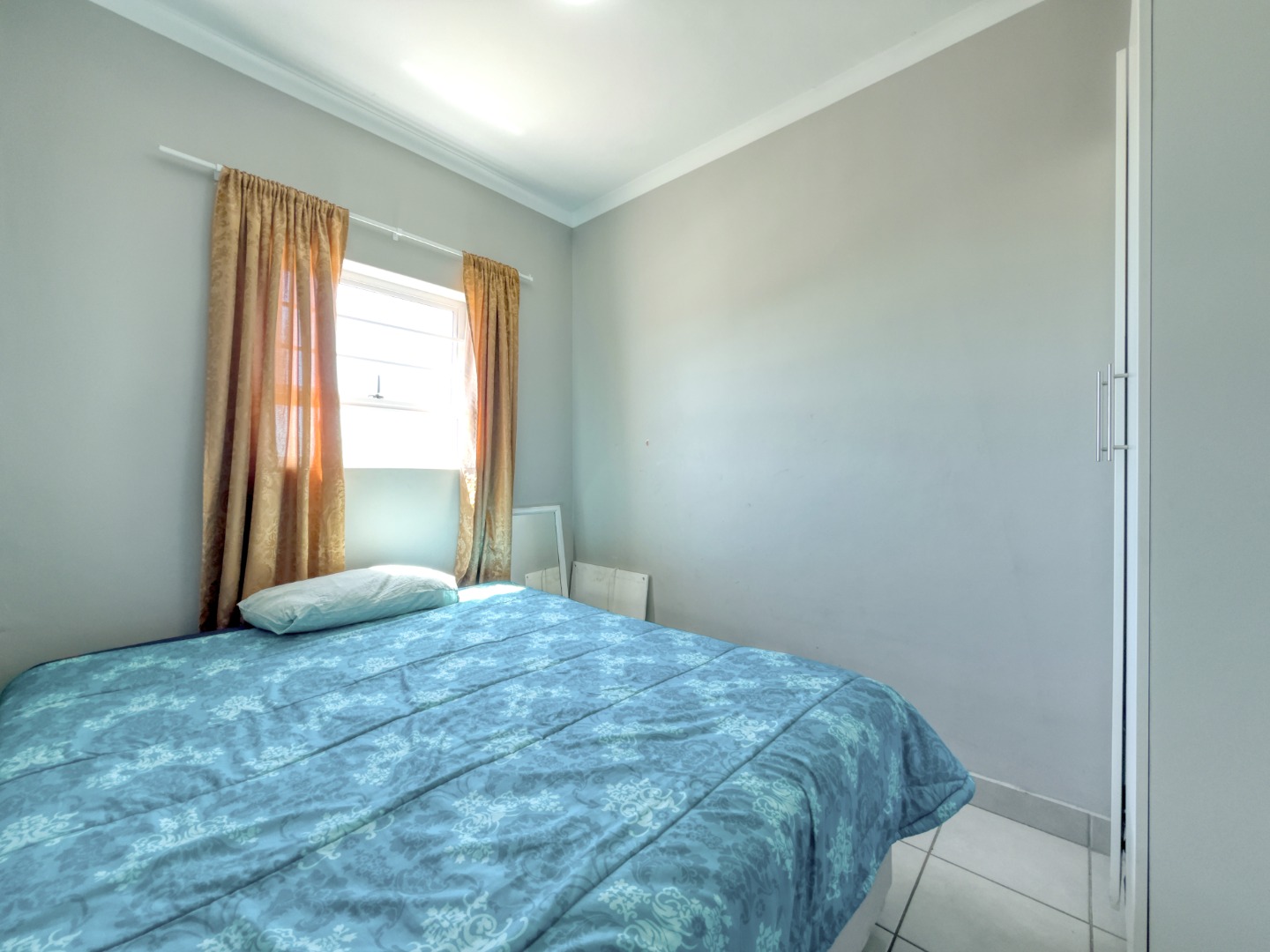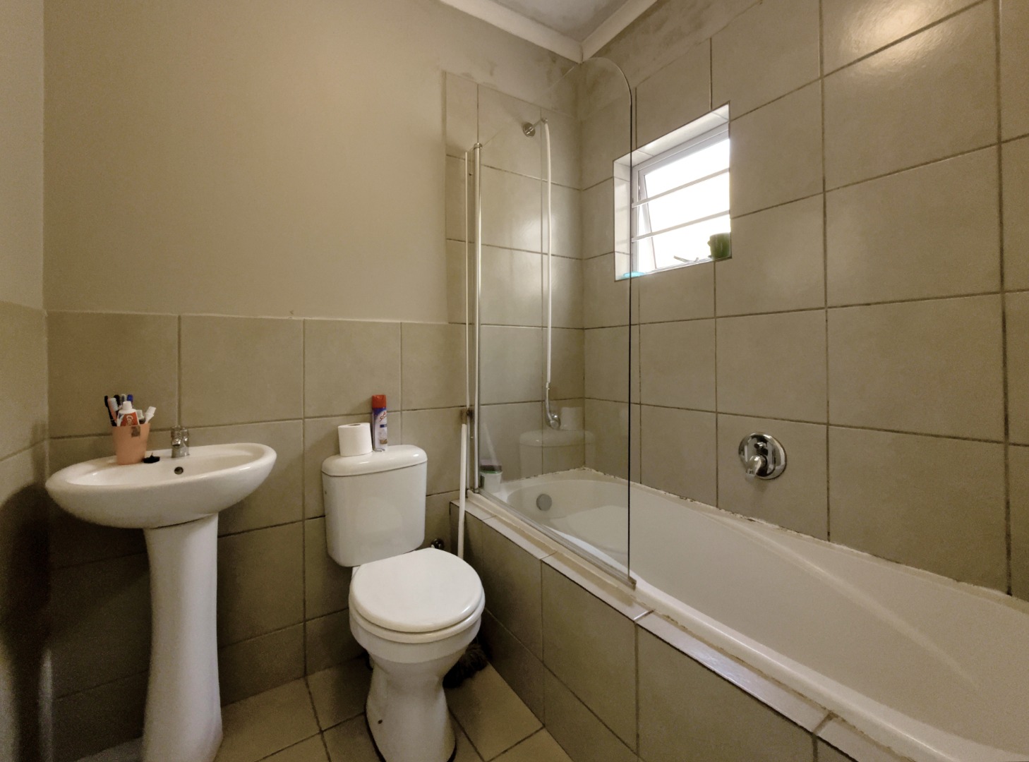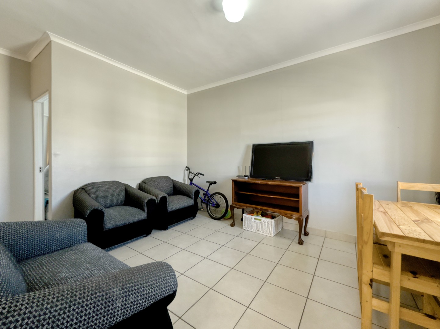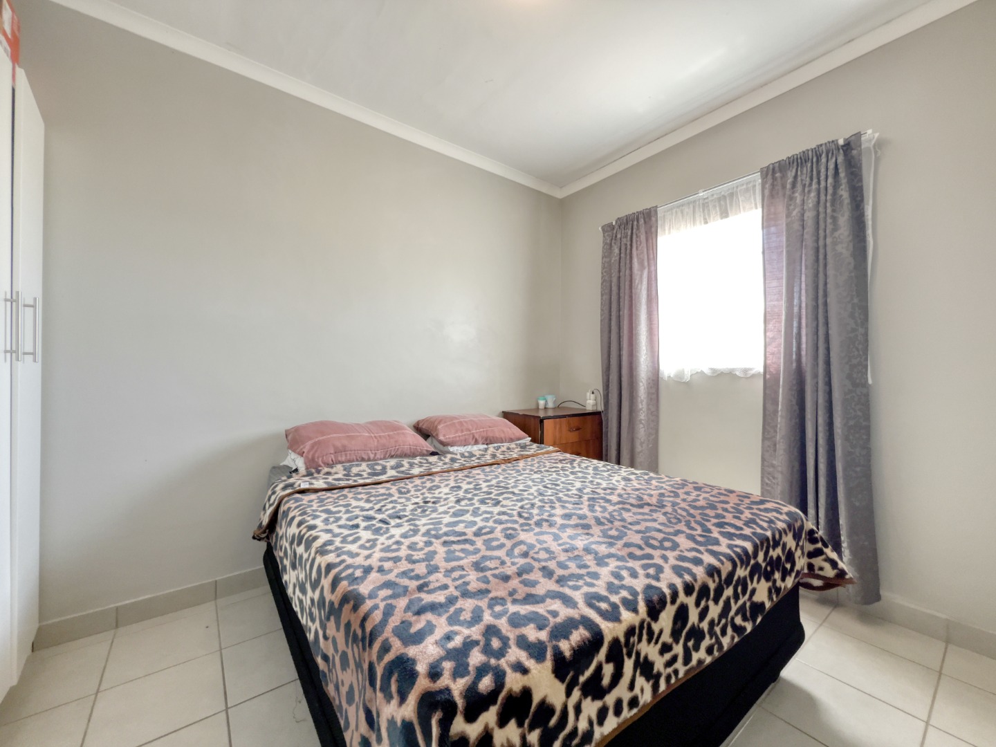 This home features three comfortable bedrooms, each designed with neutral walls and tiled flooring, offering a versatile canvas for personal touches. Natural light streams through the windows, creating bright and airy retreats. The main bedroom includes a practical built-in wardrobe, enhancing storage solutions. A well-appointed bathroom serves the household, completing the functional layout.