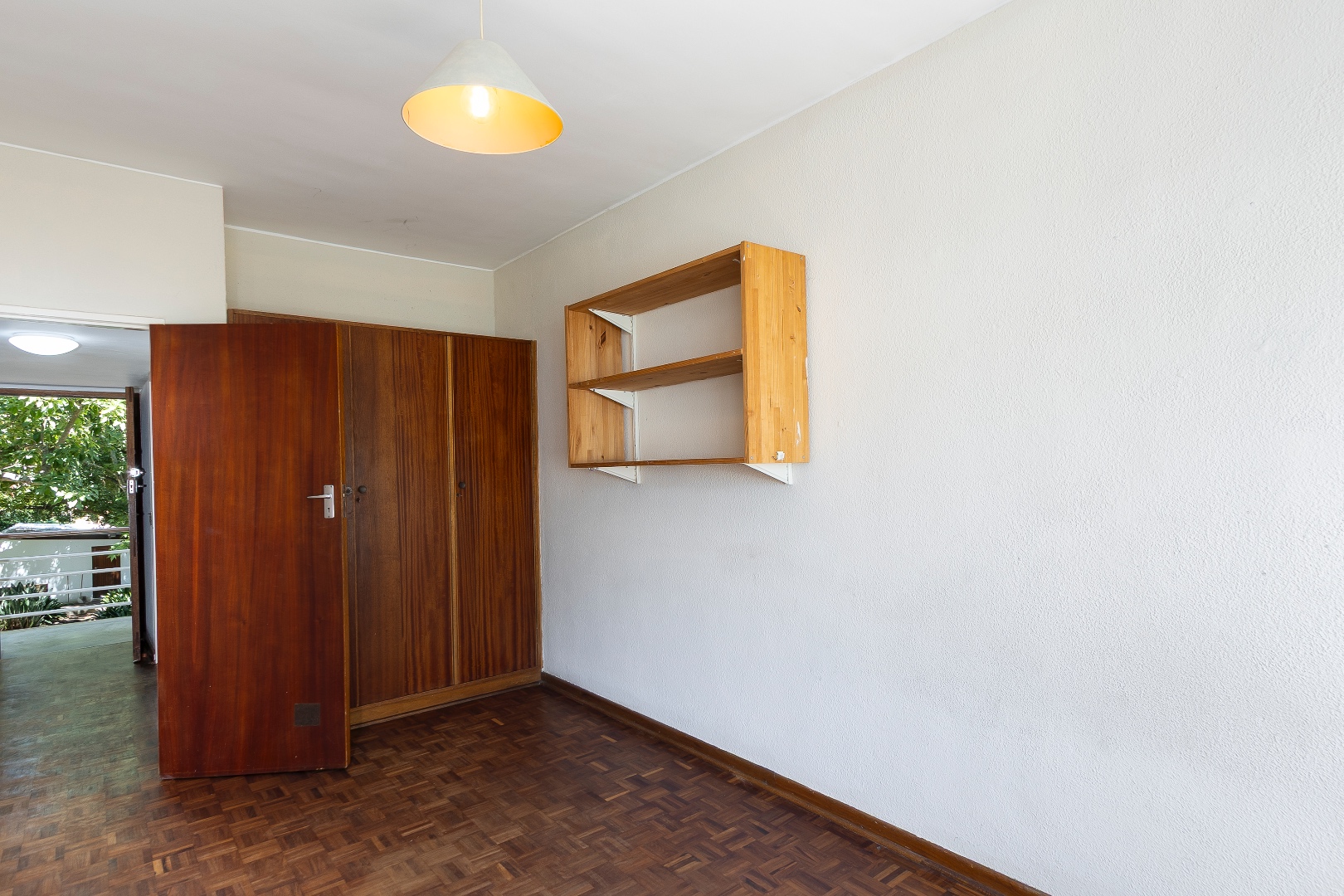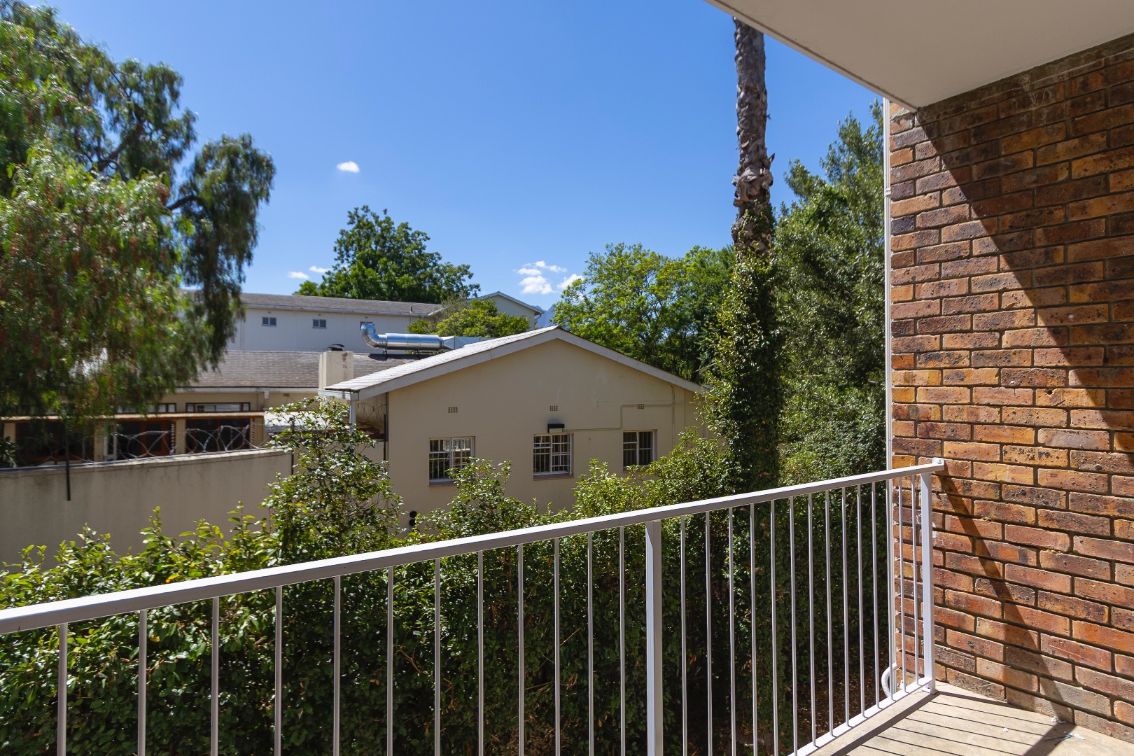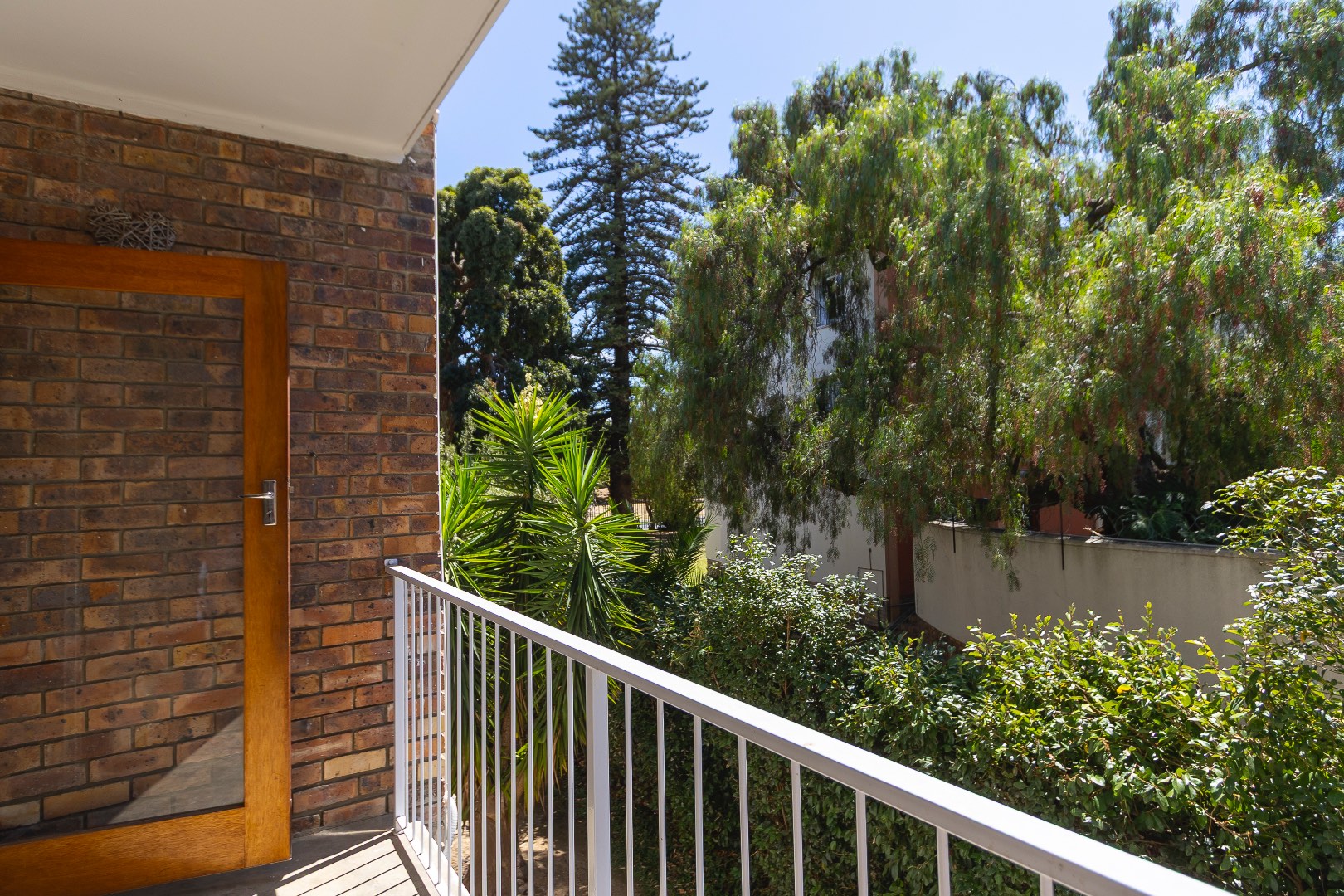 The bedroom is well-sized with built-in cupboards, while the bathroom is conveniently located and functional. Additional features include security gates, burglar bars, a private balcony with scenic greenery, and one dedicated parking bay.