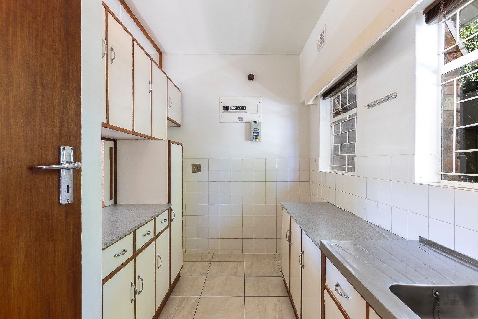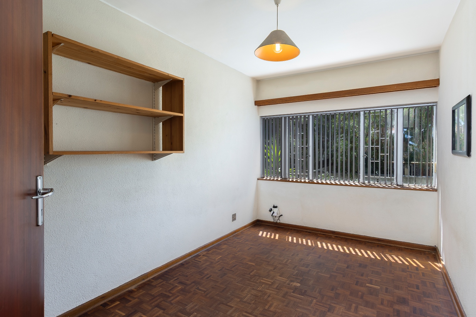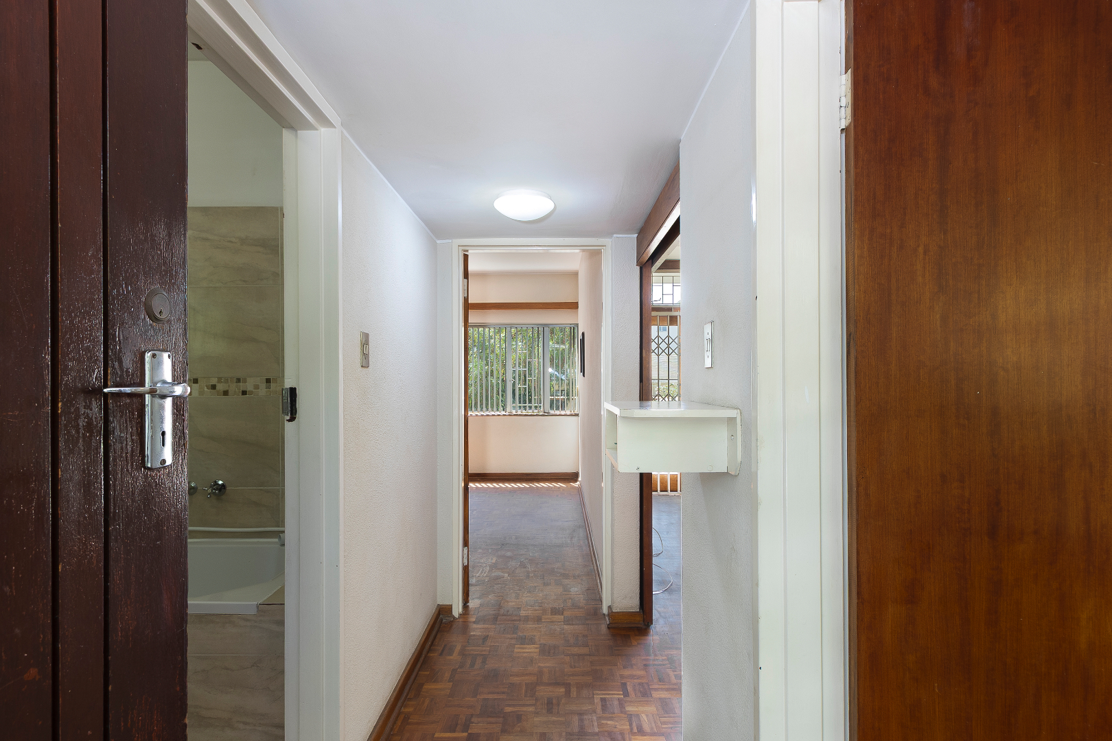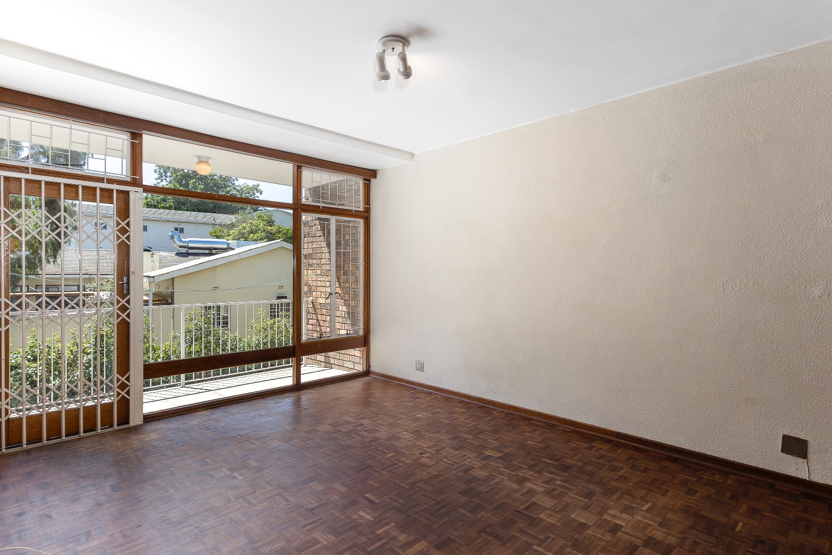 The bedroom is well-sized with built-in cupboards, while the bathroom is conveniently located and functional. Additional features include security gates, burglar bars, a private balcony with scenic greenery, and one dedicated parking bay.