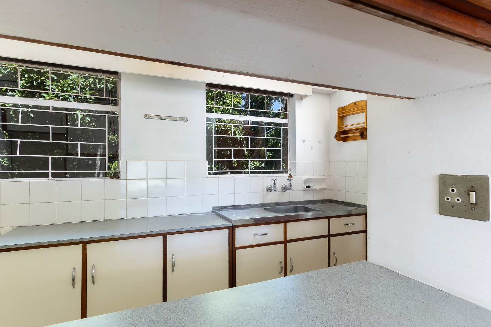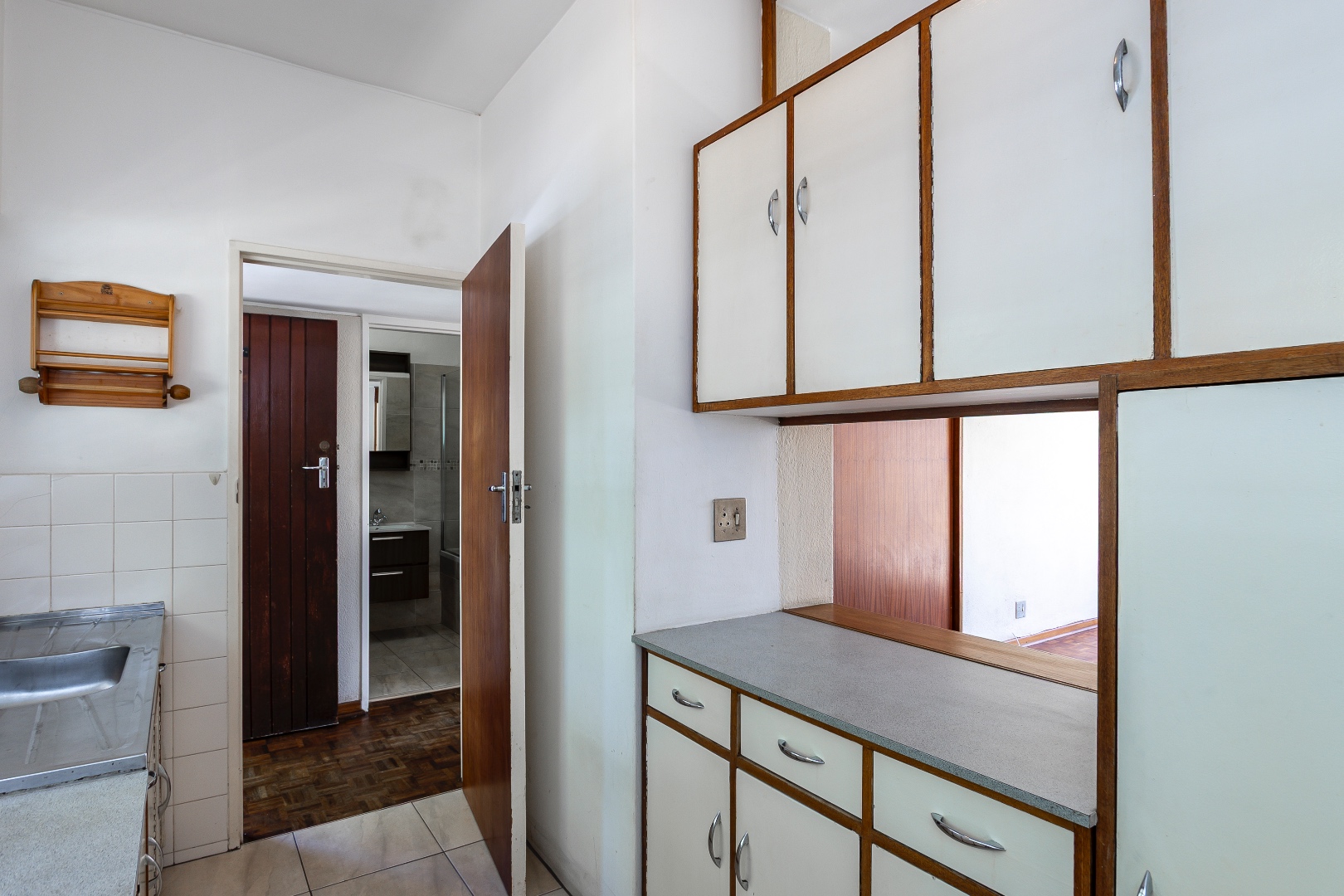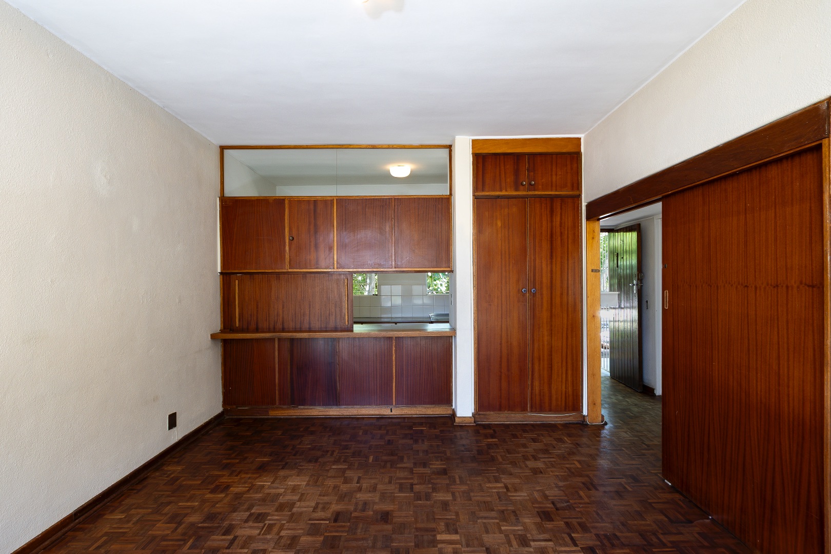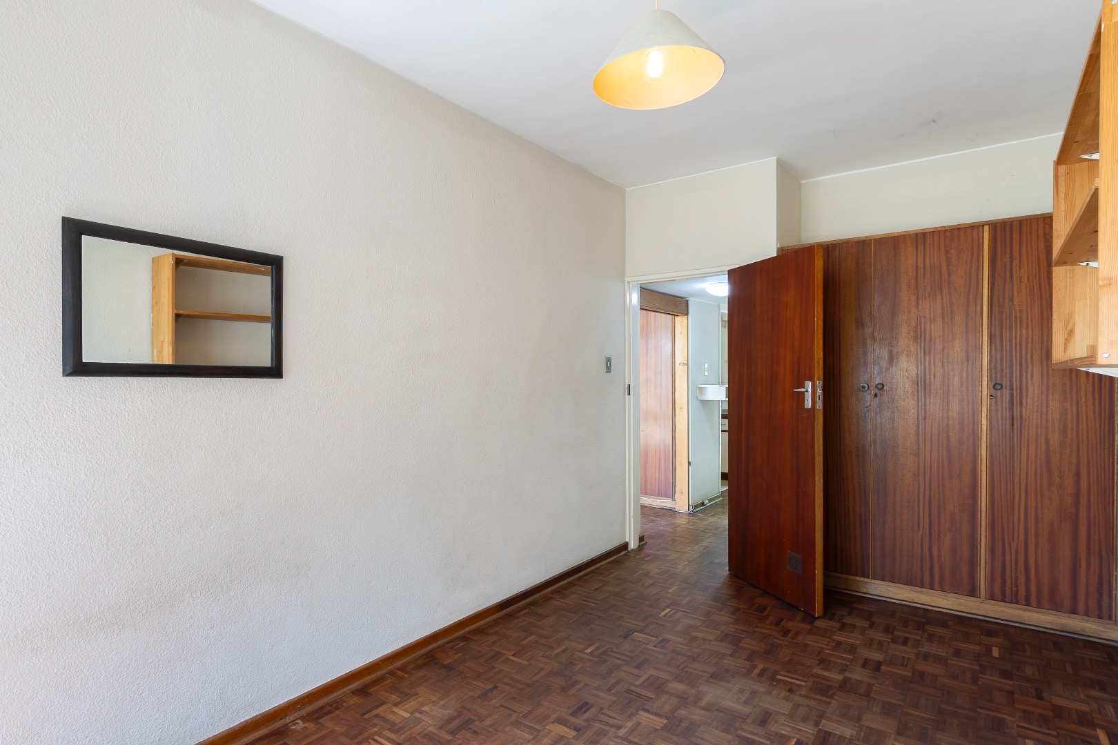 The apartment features classic parquet flooring throughout the spacious lounge and dining area, complemented by large windows that allow for excellent natural light. The kitchen offers ample cupboard space with potential for modern upgrades.
