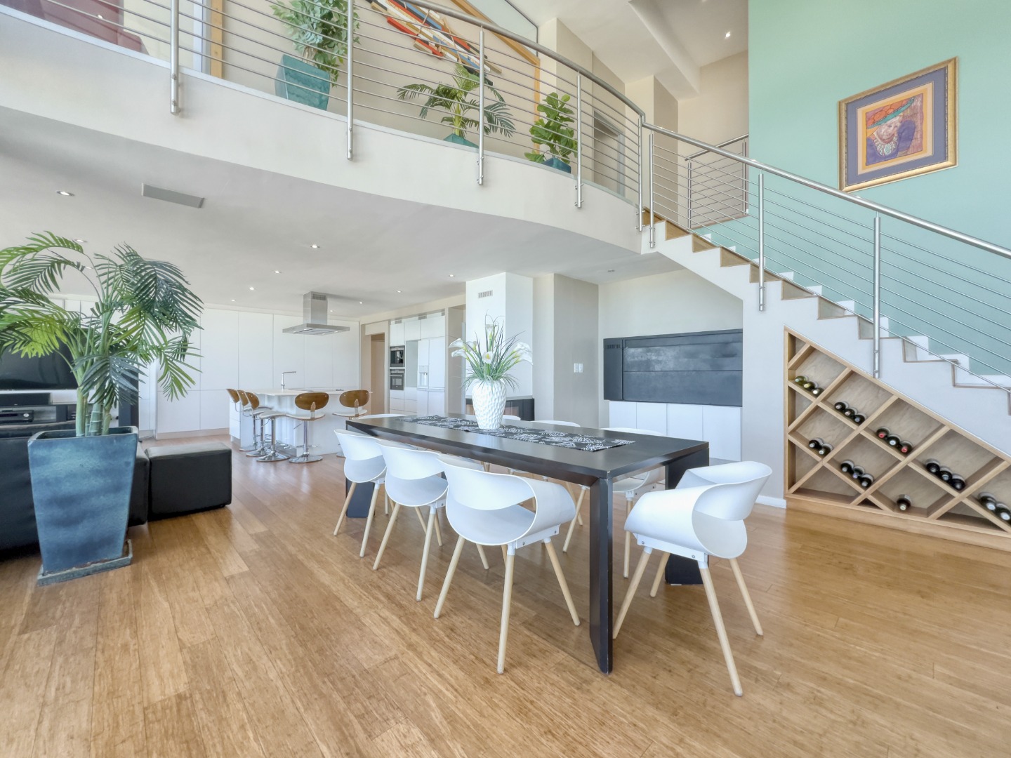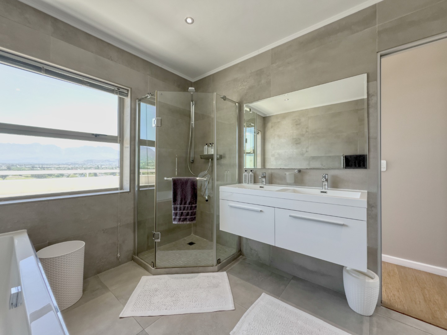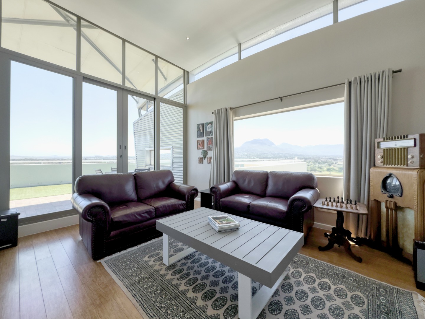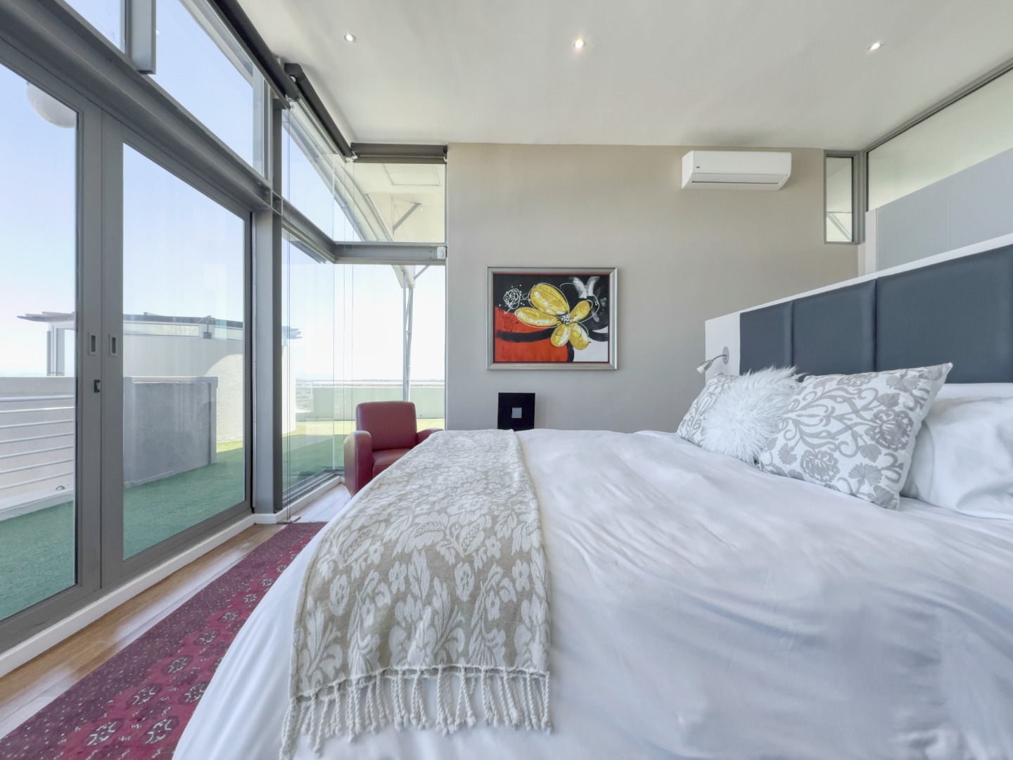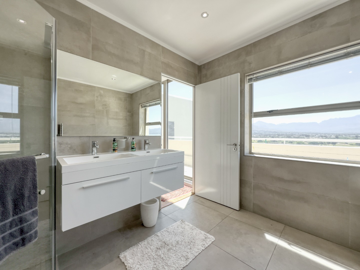 This impeccable 270m² penthouse offers luxurious living with bamboo flooring throughout and 300m² of outdoor entertainment space featuring artificial grass and Grappa timber decks. The master suite opens up onto the private rooftop terrace, which boasts an enclosed jacuzzi with incredible sea views, perfect for relaxation. The guest suites also have balcony access overlooking the entire Winelands.