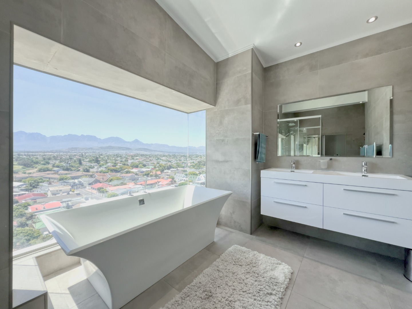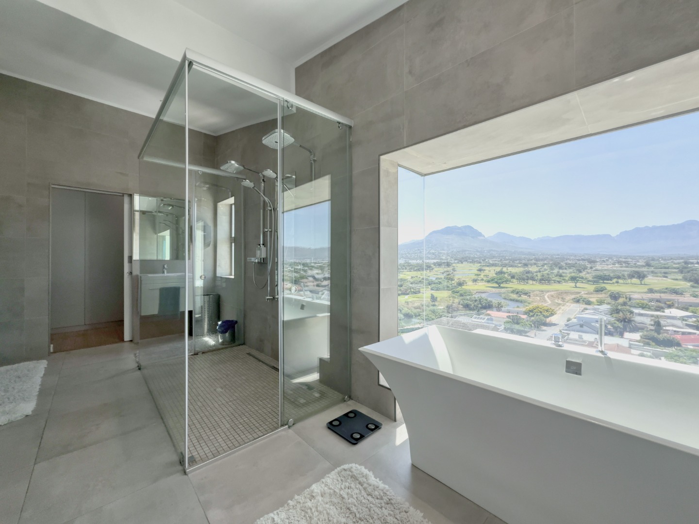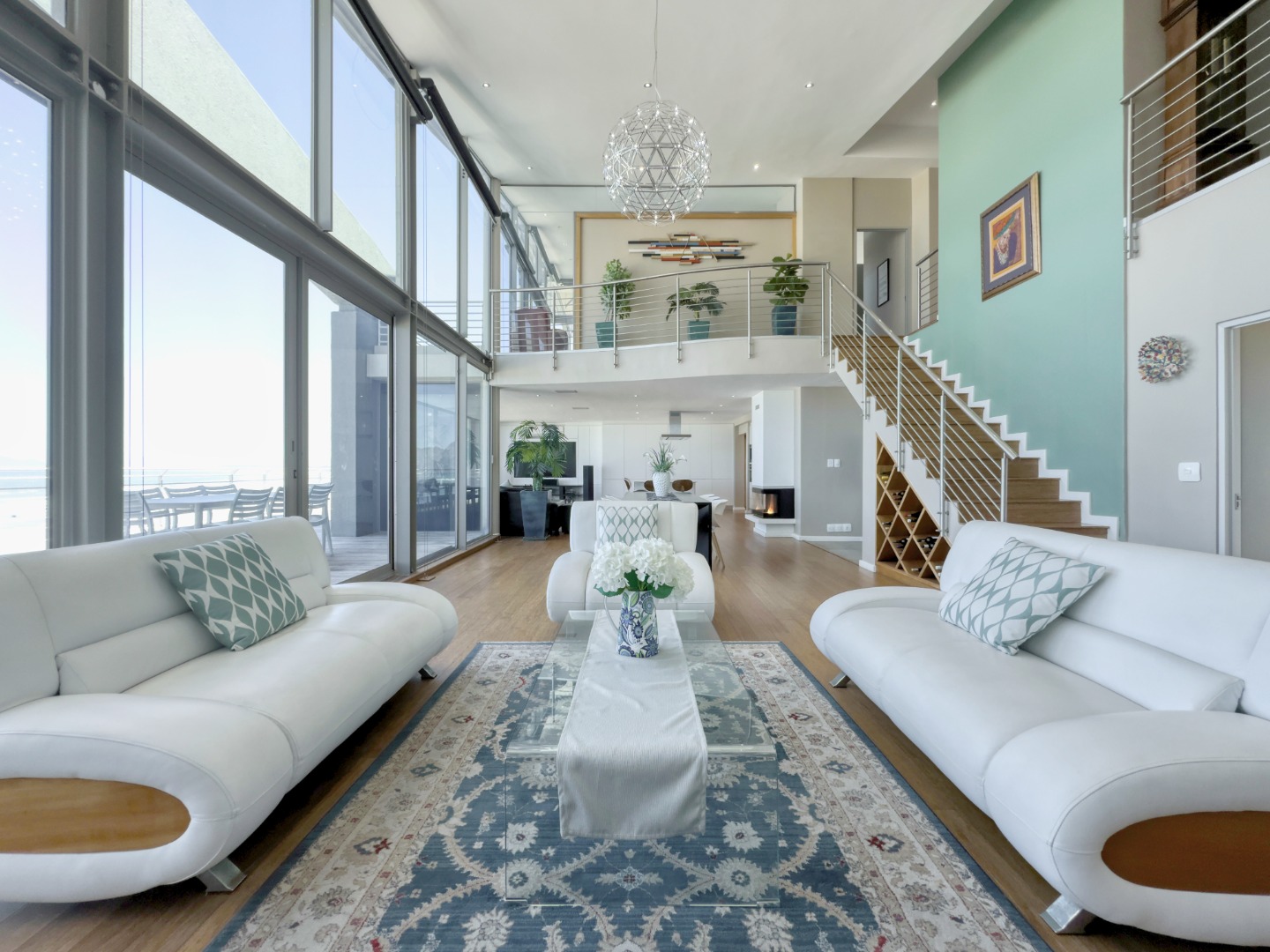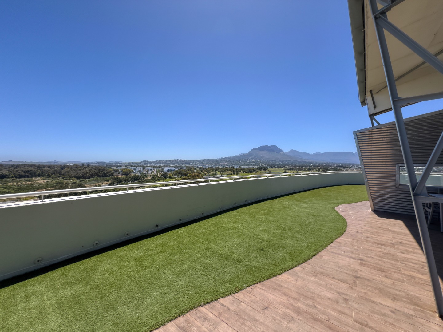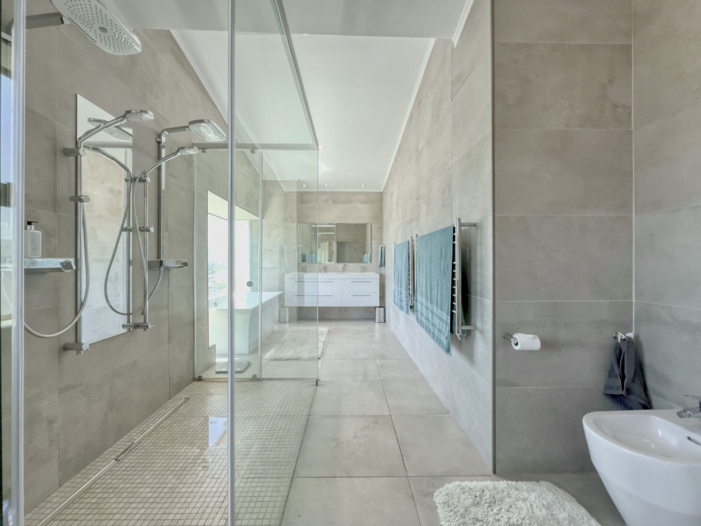 This impeccable 270m² penthouse offers luxurious living with bamboo flooring throughout and 300m² of outdoor entertainment space featuring artificial grass and Grappa timber decks. The master suite opens up onto the private rooftop terrace, which boasts an enclosed jacuzzi with incredible sea views, perfect for relaxation. The guest suites also have balcony access overlooking the entire Winelands.