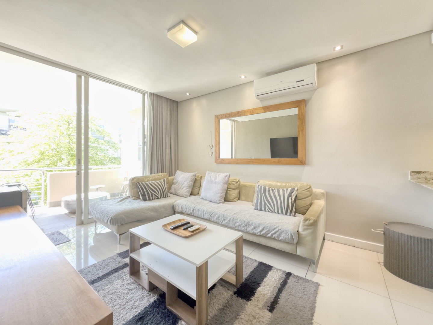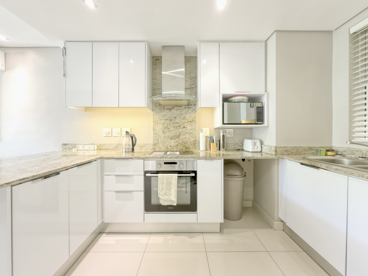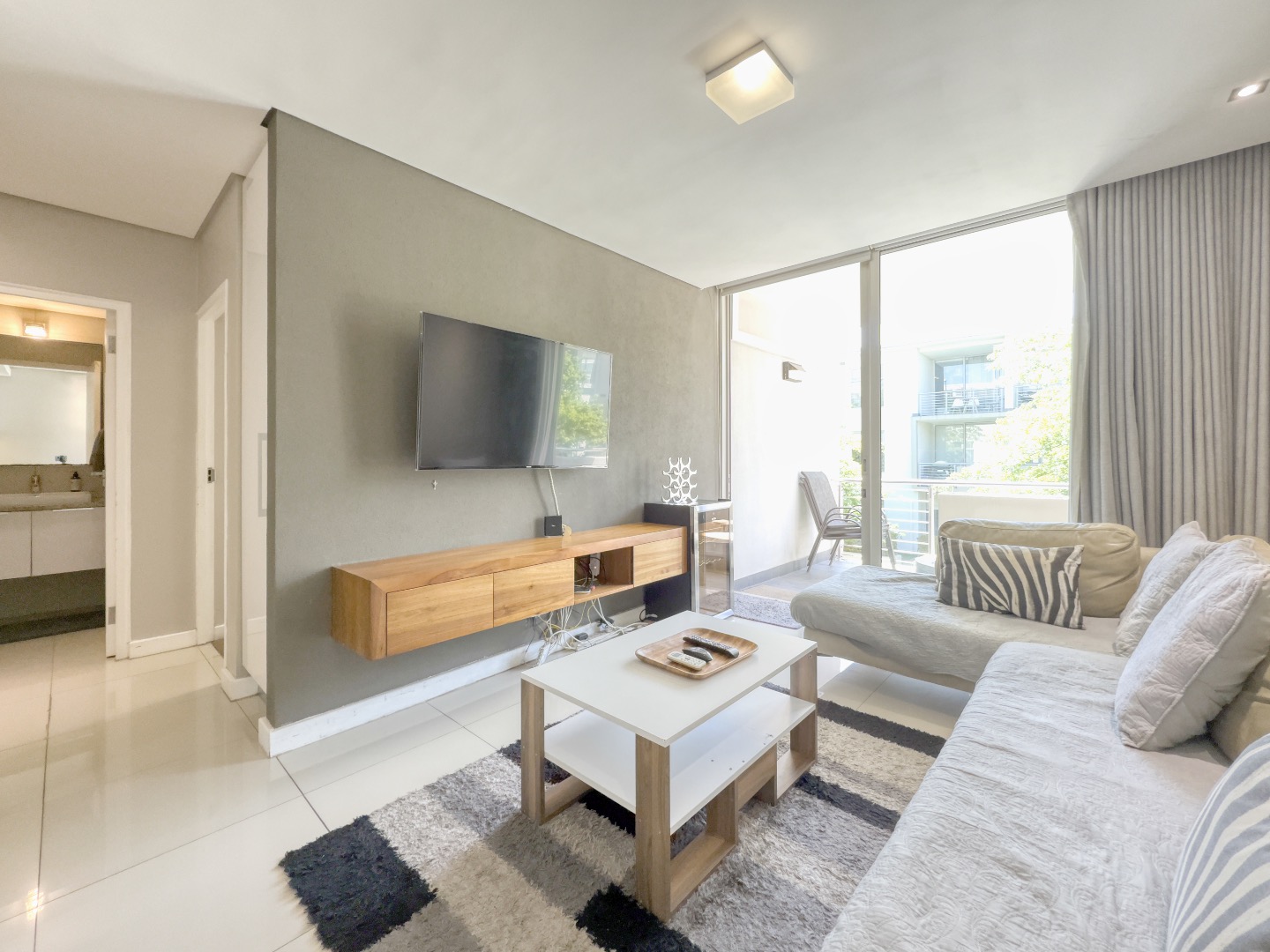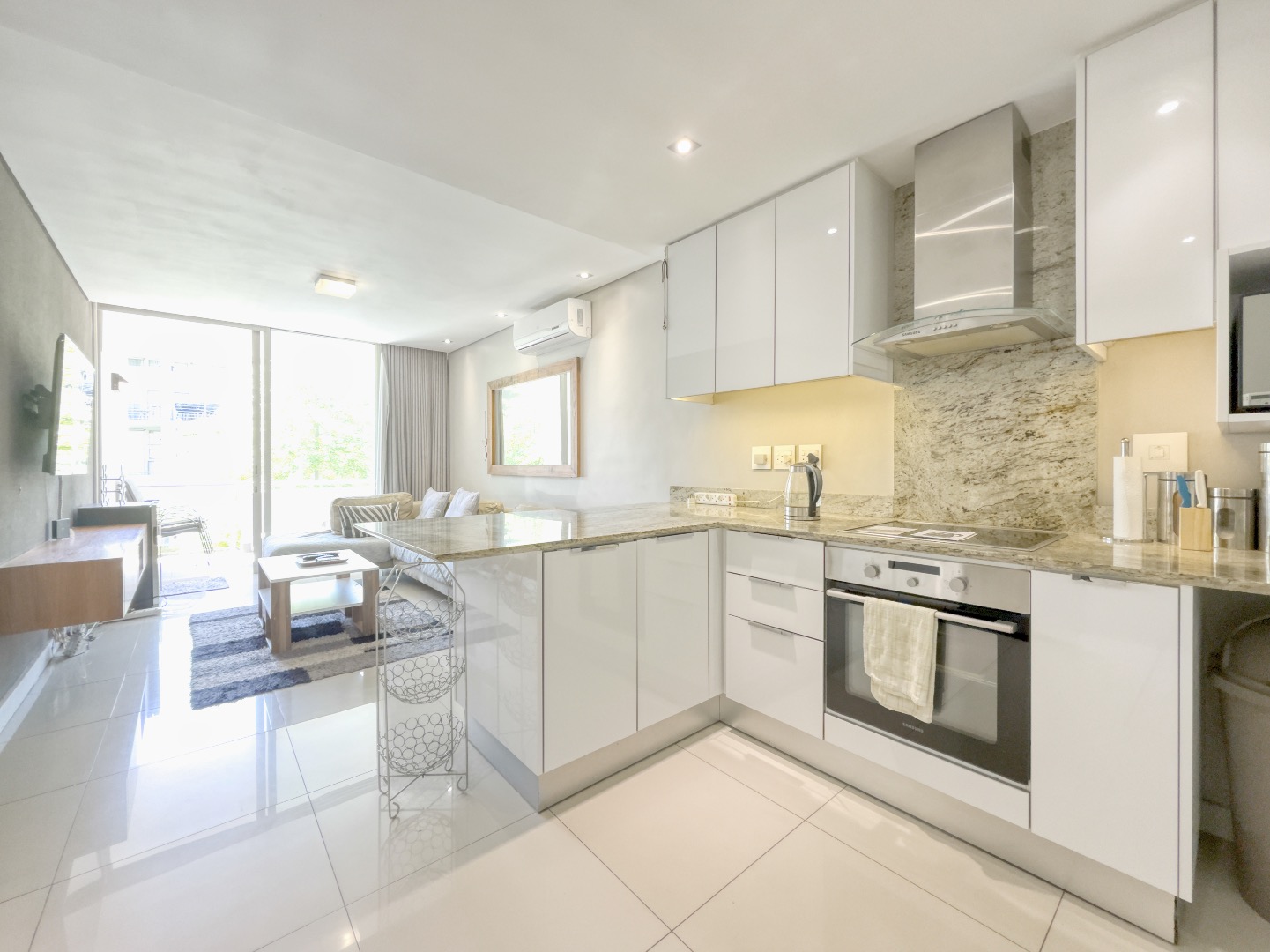 The apartment features a spacious open-plan living and dining area with contemporary furnishings, a smart TV, and direct access to a private balcony overlooking Andringa Street — perfect for morning coffee or evening relaxation. The kitchen includes a fridge/freezer, oven, hob, microwave, washing machine, and all essential cookware and utensils.