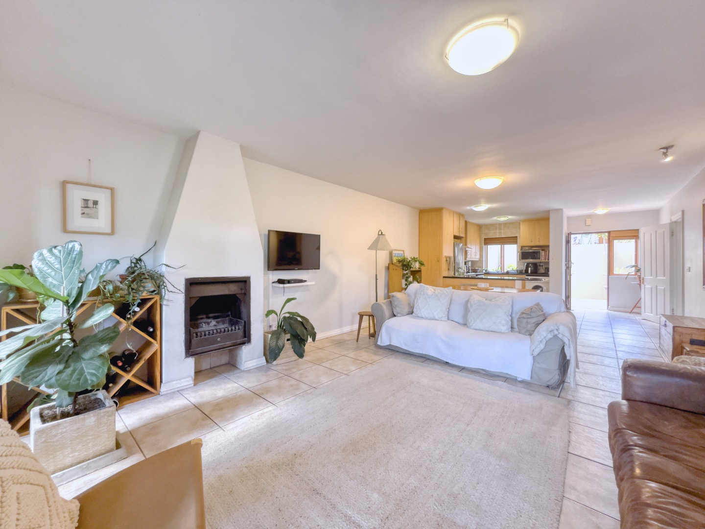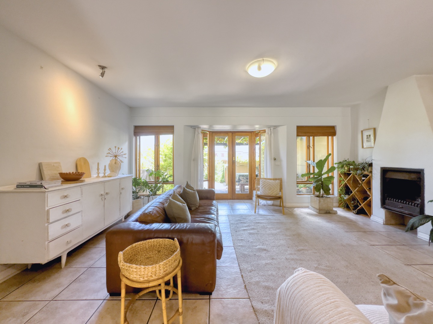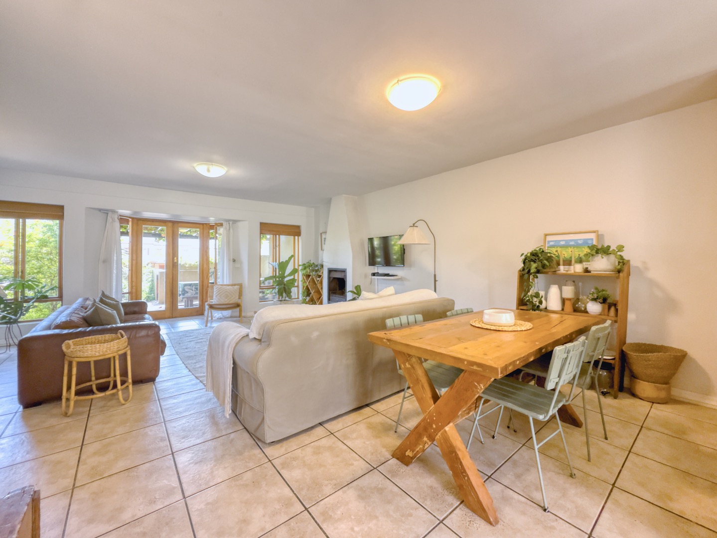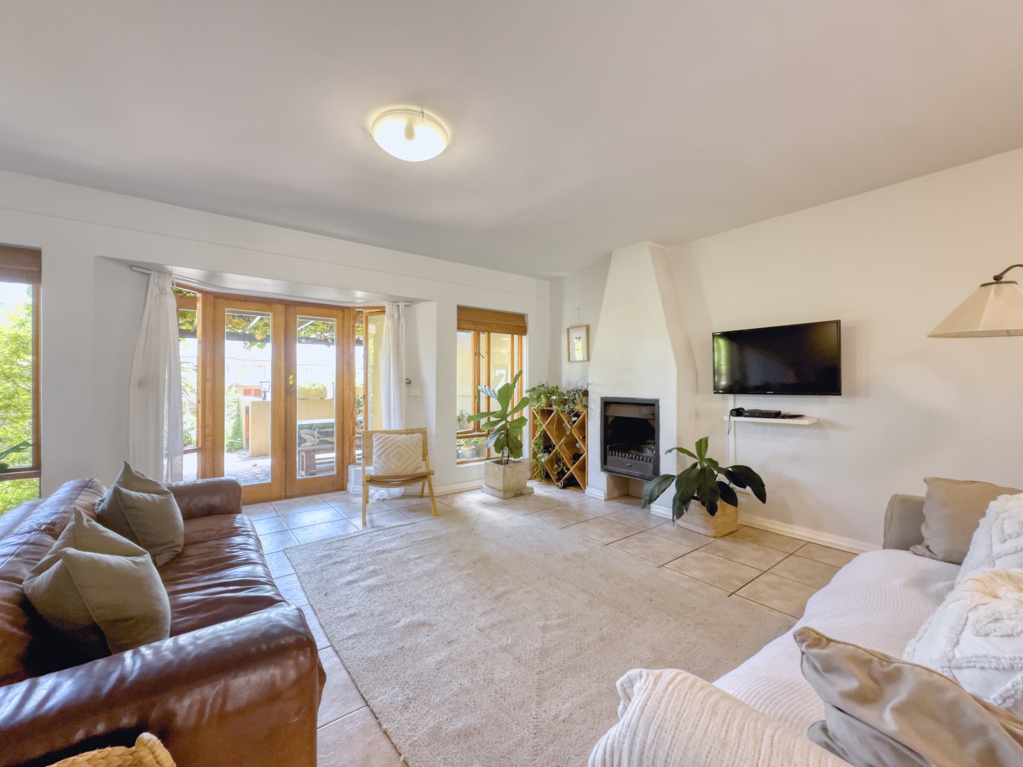 The home features a light-filled open-plan layout that seamlessly connects the lounge, dining area, and kitchen. Large windows and glass doors allow for abundant natural light while providing access to the outdoor area. A cosy fireplace adds warmth and character to the main living space, while tiled flooring throughout ensures practicality and easy maintenance.